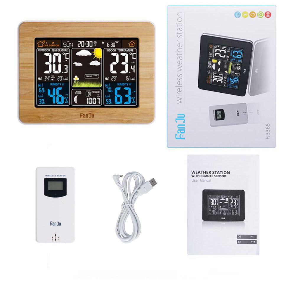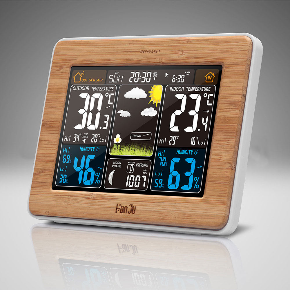 FanJu FJ3365 Weather Station Radio Wave Clock RF Weather Clock Perpetual Calendar Bamboo Surface
