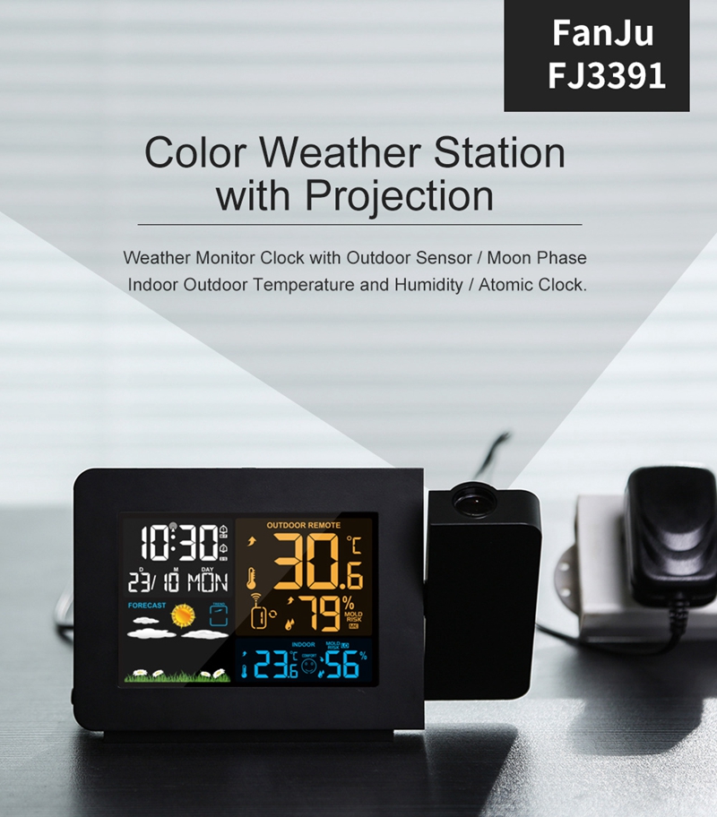 FanJu FJ3391 Weather Station Projection Clock Alarm Clock For Indoor Outdoor Temperature Humidity