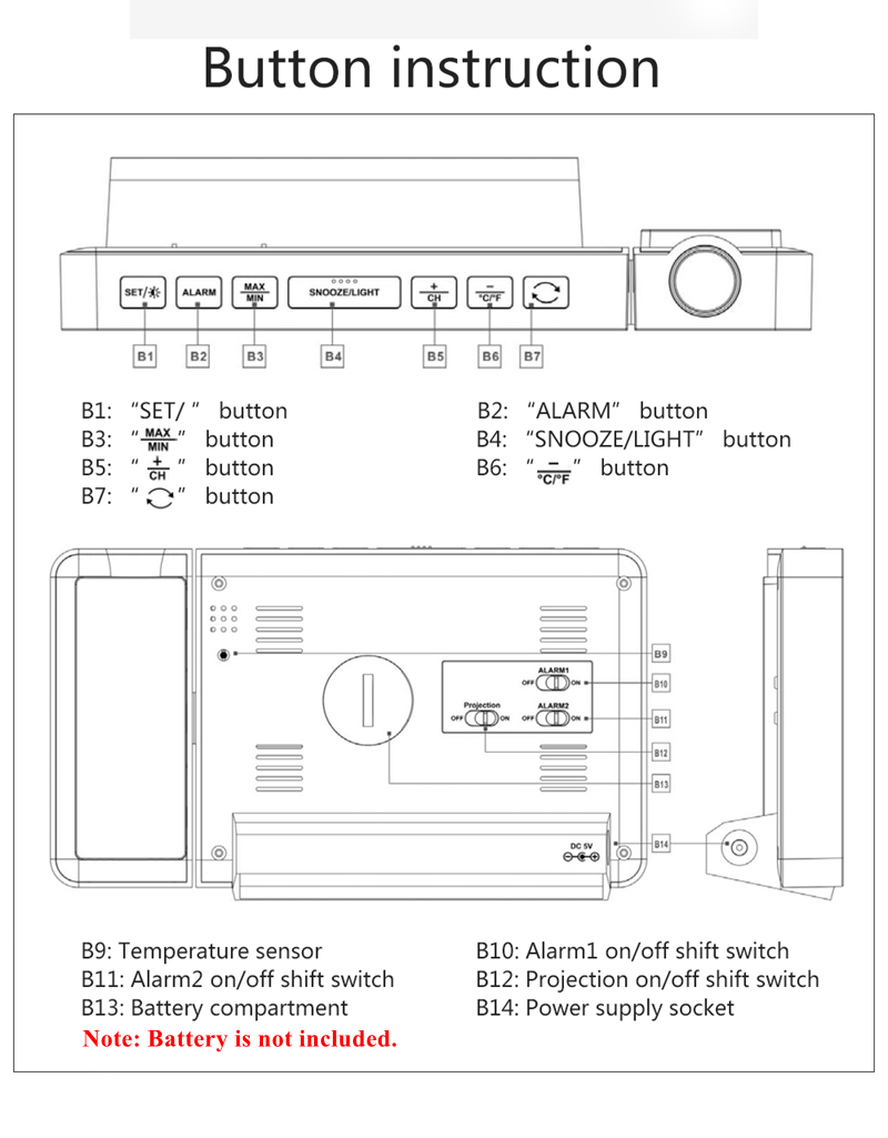 (1) The projection function supports simultaneous projection of "time and temperature". There is a switch to select continuous projection or turn off projection. "Indoor temperature + time" and "outdoor temperature + time" are displayed alternately