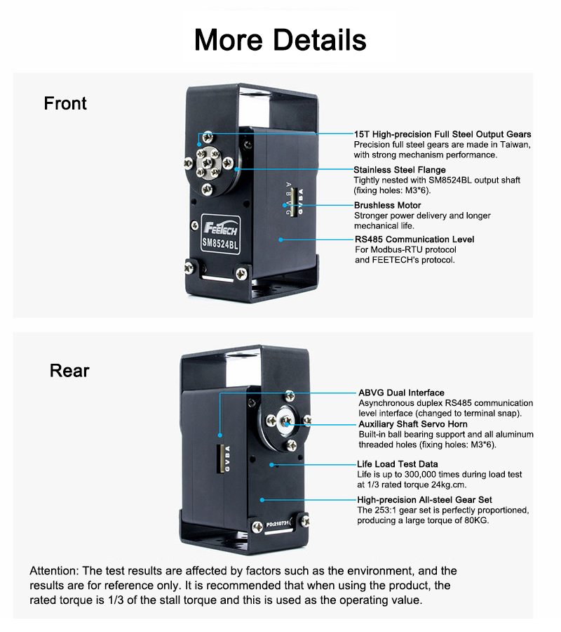 - 24V 85KG.CM brushless intelligent micro servo motor of high torque: reduction gear + brushless motor + high-precision 12-bit magnetic encoder sensor + FEETECH control board + RS485 communication. New concept power execution module is developed based on high reliability, scalability and basic functions.