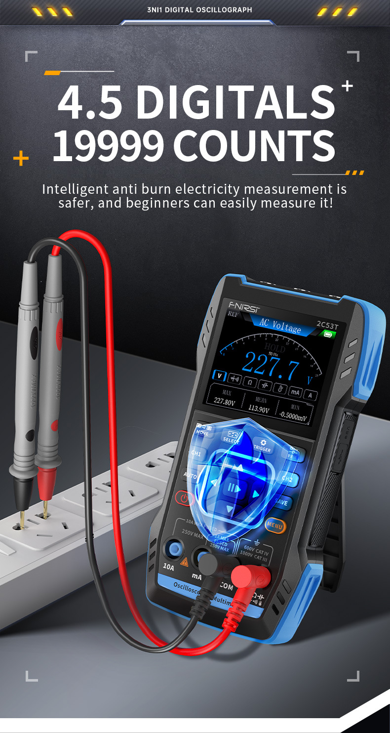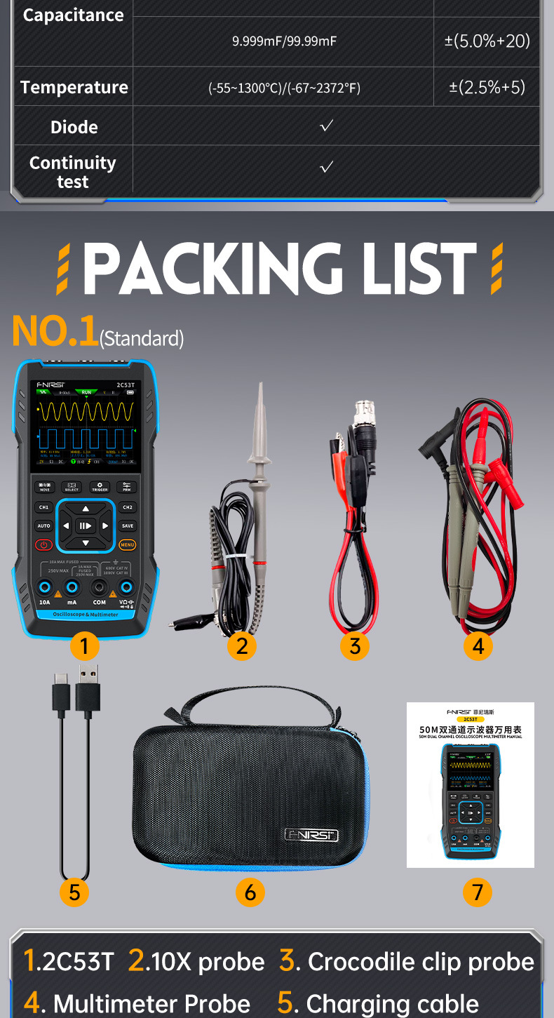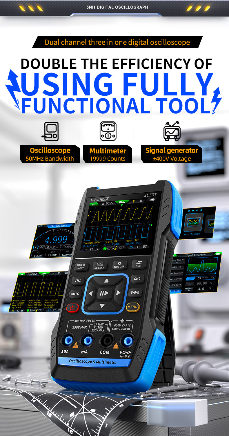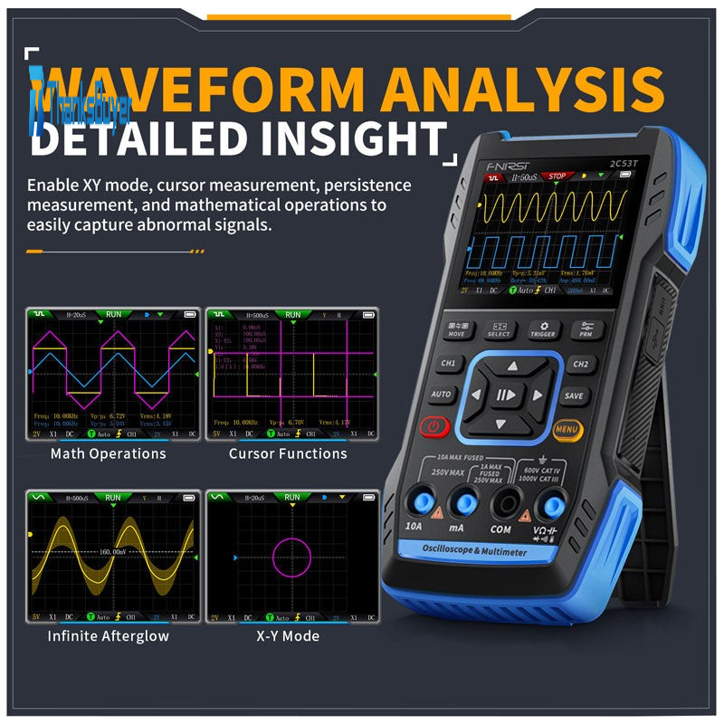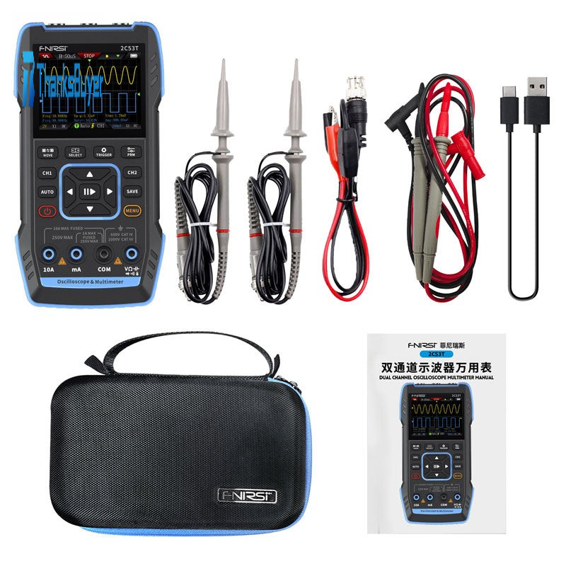 FNIRSI 2C53T Advanced Version Dual Channel 50MHz Digital Oscilloscope Multimeter Signal Generator with Two 10X Probes