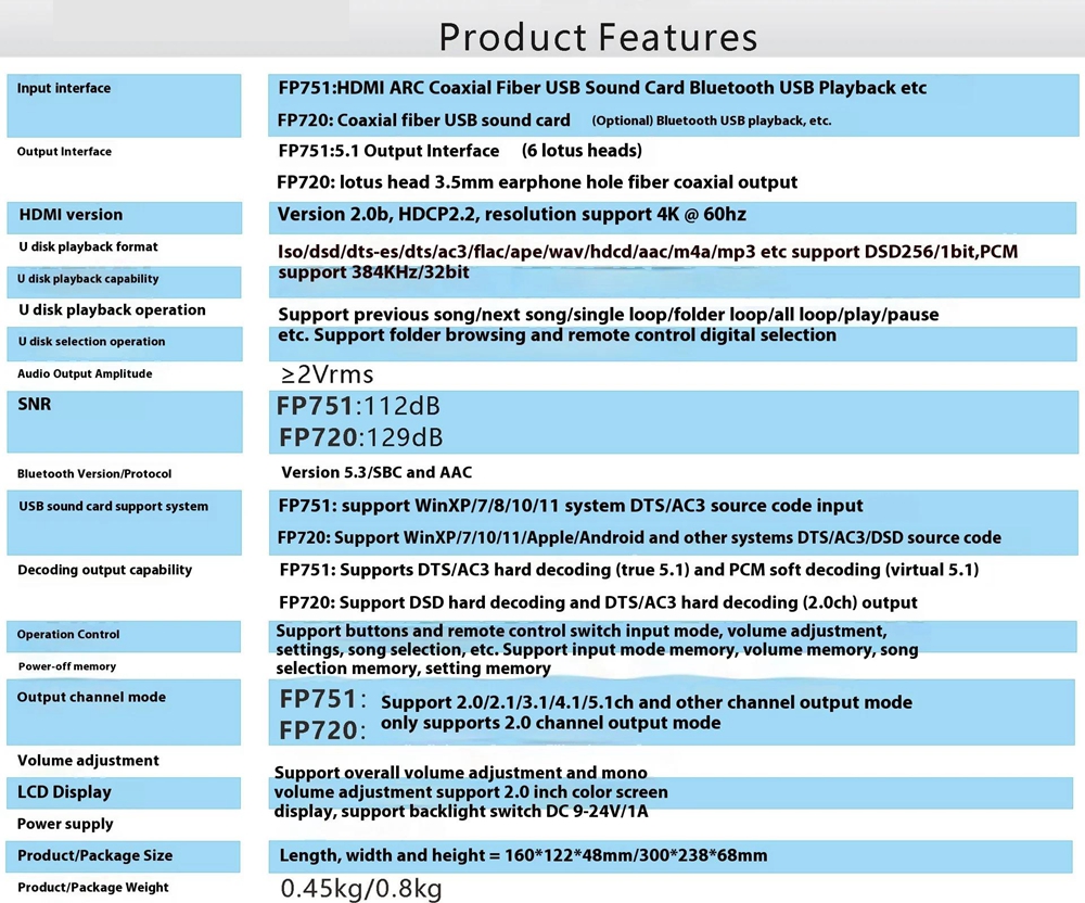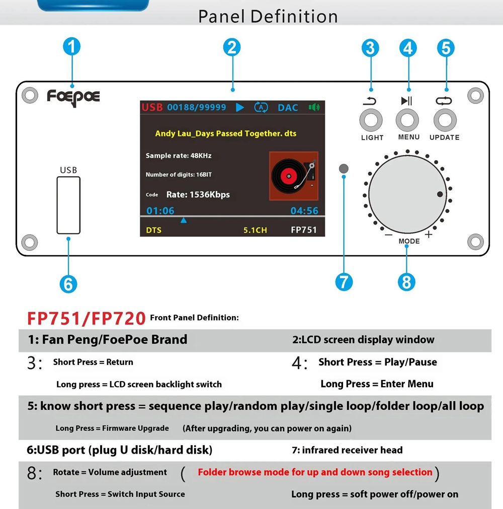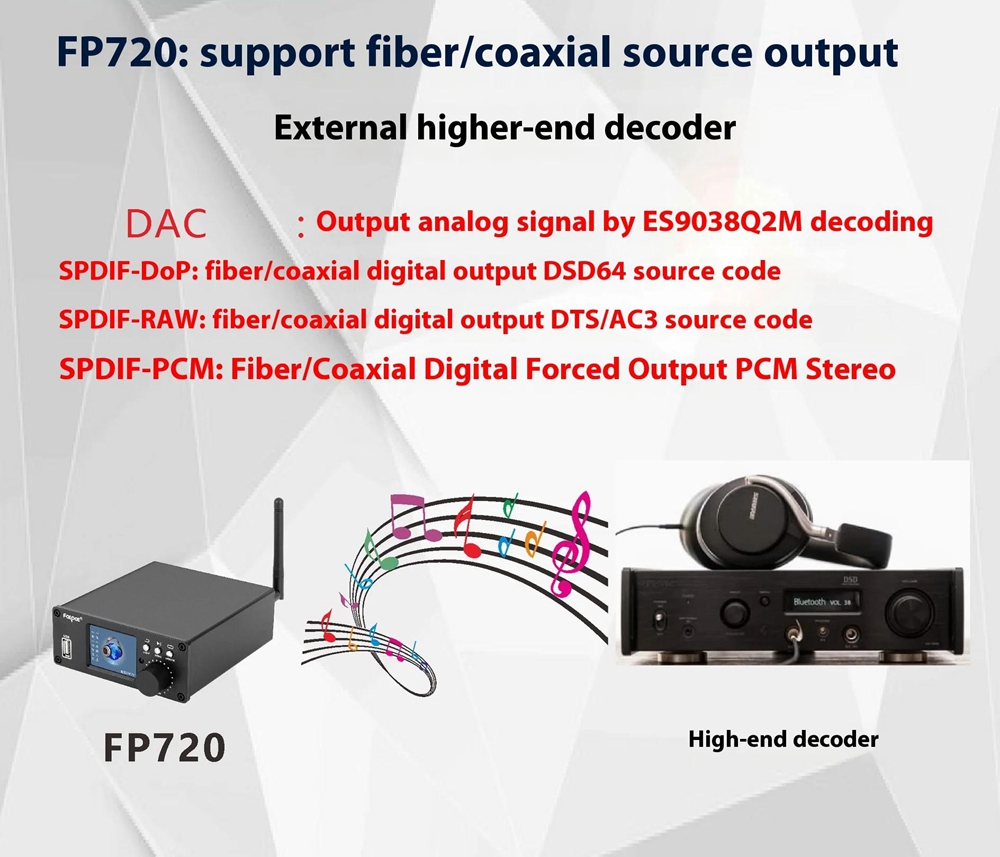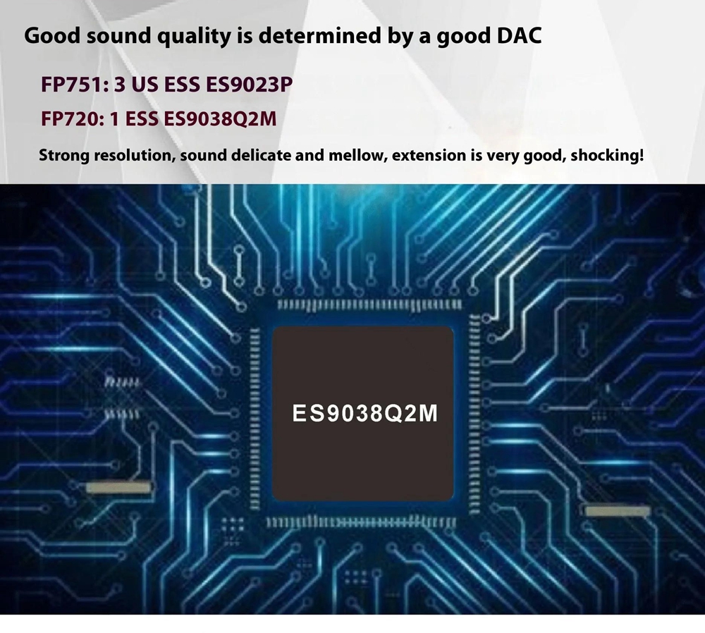 FP720 HiFi Audio Decoder Bluetooth5.3 DSD Digital Turntable ES9038Q2M DAC 2-inch Color Screen with SA9227 Sound Card