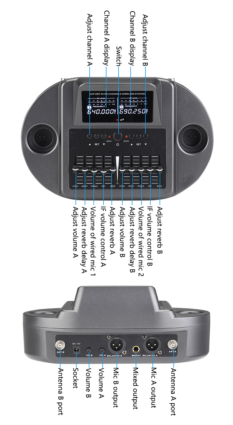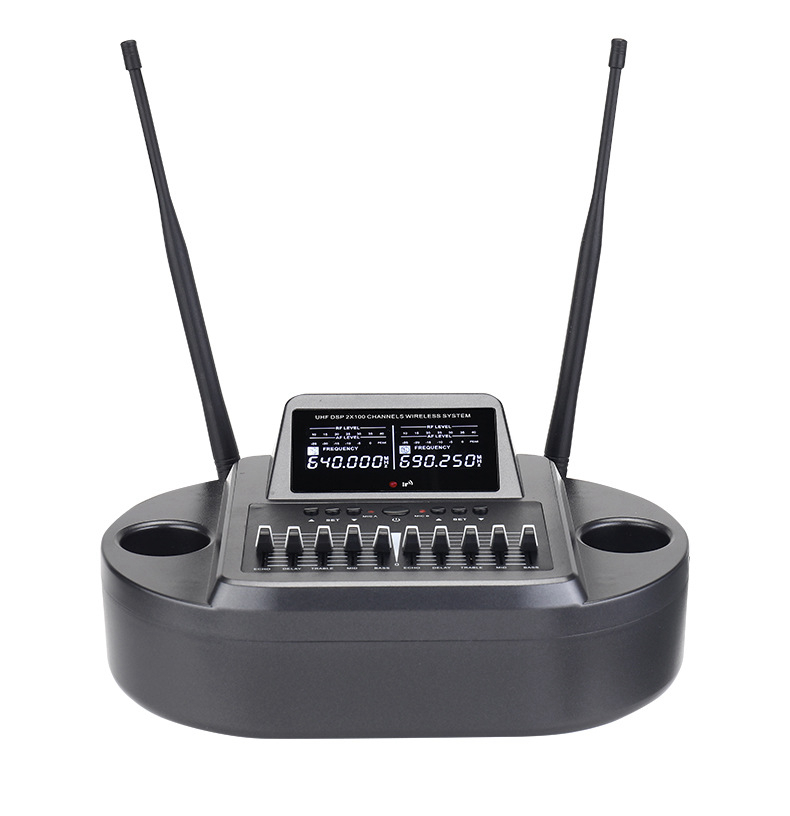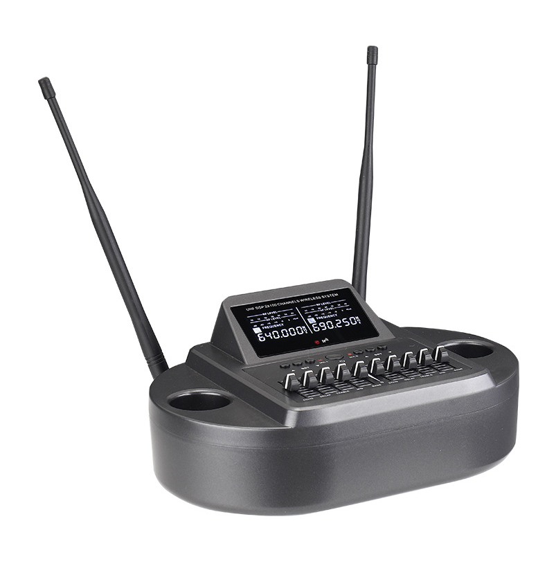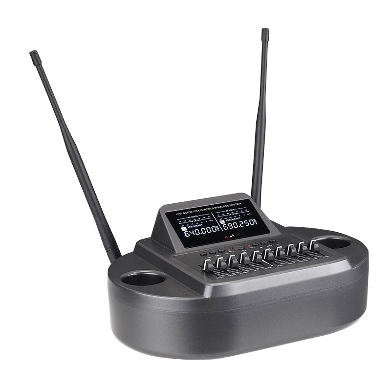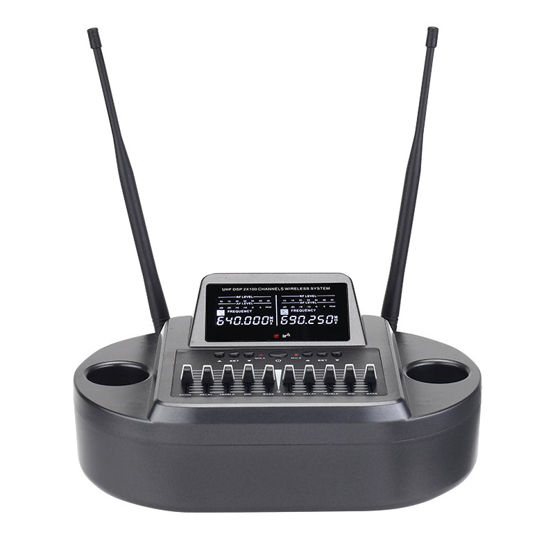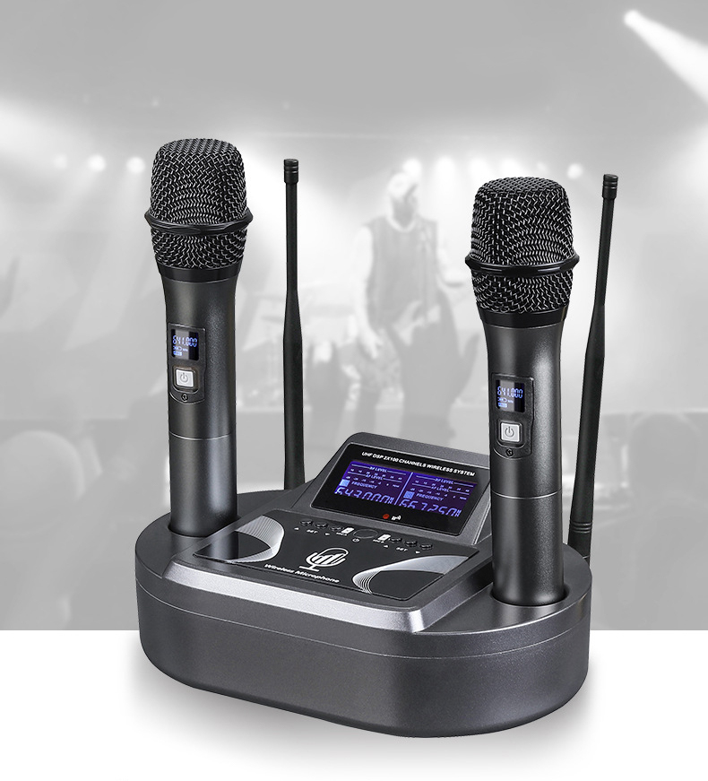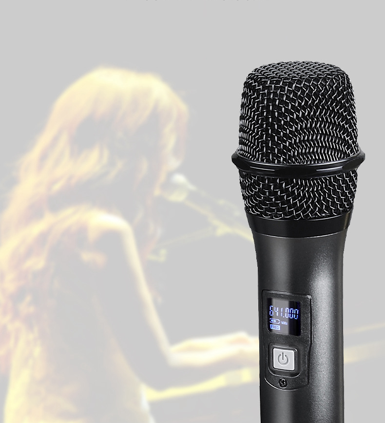 - Digital LCD displays the real-time power and frequency band of the microphone
