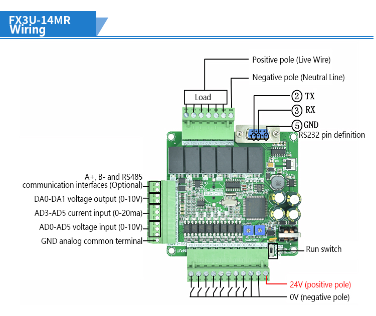 * The input point X component of FX3U-14MR: Y0-Y5 are relay outputs, a total of 6 points. Can control AC contactors, intermediate relays and solenoid valves (5A)