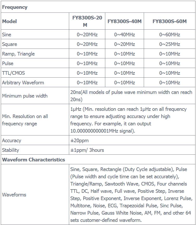 FY8300S series dual-channel function / arbitrary waveform generator is a high-performance and cost-effective signal generator. It can be used as a function signal generator, arbitrary waveform generator, pulse signal generator, VCO, frequency sweeper, counter and frequency meter. Rich shortcut keys simplify complicated operations. It is especially suitable for electronic enthusiasts, scientific research institutions and high-tech enterprises, automotive repair and other fields.