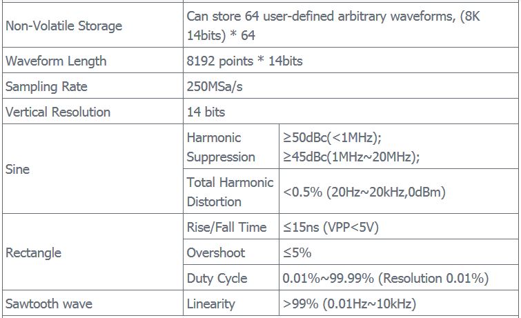 ◆ The highest output frequency is 60MHz (sine wave), 250MSa / s sampling rate, 14bits vertical resolution.