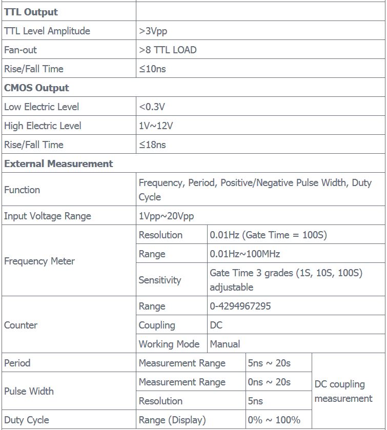 ◆ 100M Frequency Meter Function: Four measurement methods: frequency measurement, period measurement, positive and negative pulse width measurement, and duty cycle measurement. The maximum measurement frequency can reach 100MHz, and the minimum measurement frequency is 0.01Hz.