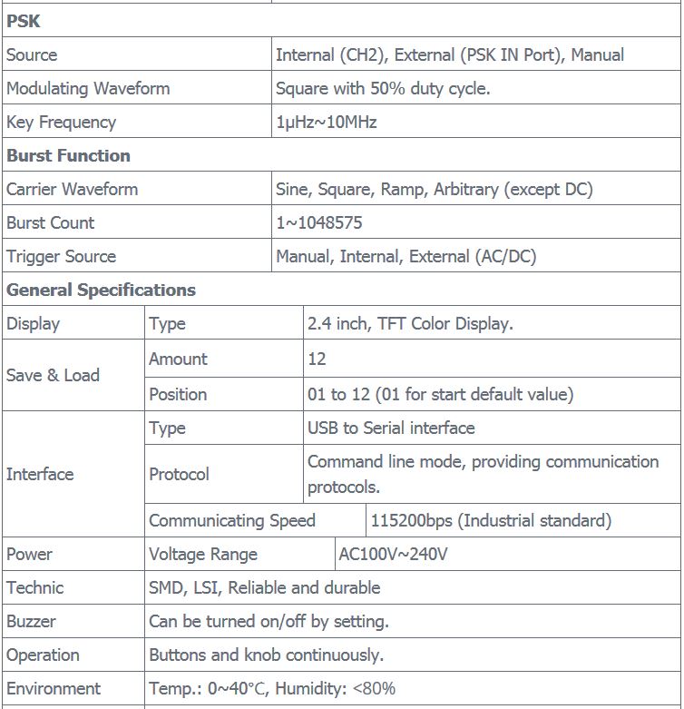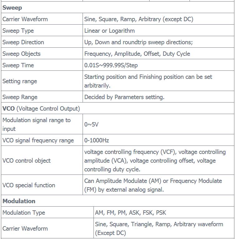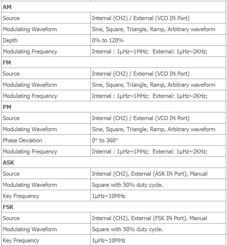 ◆ Rich Modulation Types: AM, FM, PM, ASK, FSK and PSK modulation.