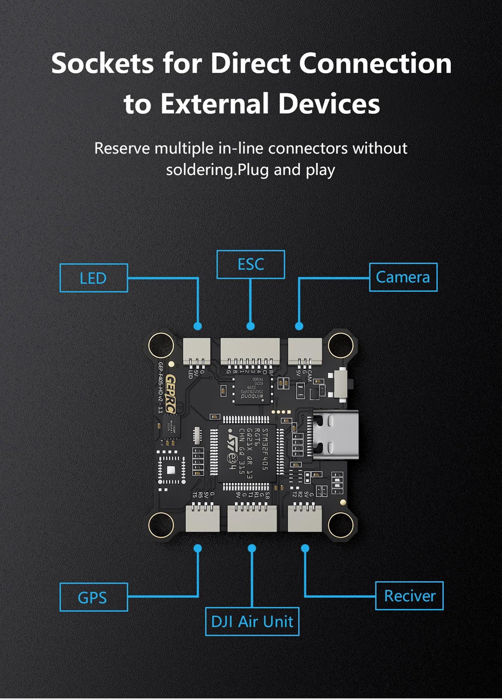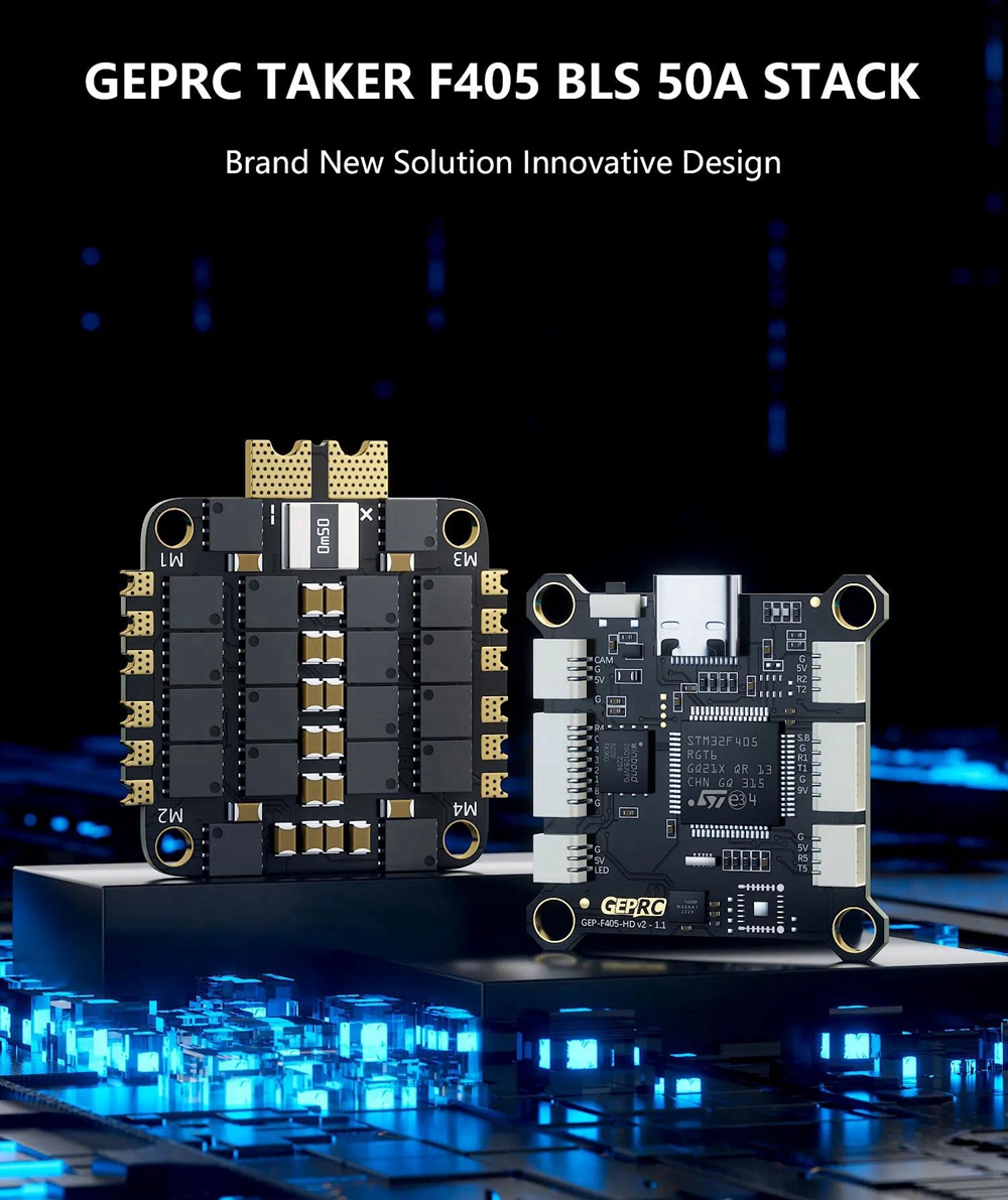 - GEPRC TAKER F405 BLS 50A is a plug and play stack system specifically designed for DJI Air Unit. Using STM32F405 chip, 1CM42688-P gyroscope, integrated 16M black box, combined with GEP-BL S50A-4 IN1 electric adjustment, provides a more delicate tactile experience. The GEPRC TAKER F405 BLS 50A Flying Tower supports direct insertion into the DJI Air Unit, eliminating the hassle of welding. Upgrading the USB interface of Type-C greatly improves the lifespan of the socket and reduces the risk of poor contact. 9V 2.5A+5V 3A dual independent BEC, with more stable power supply for external equipment.
