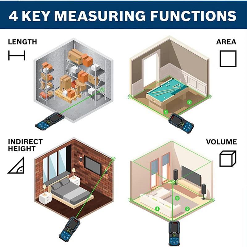 - Integrated 360° tilt sensor for easy angle / inclination measurement, an added versatility to the laser measure.