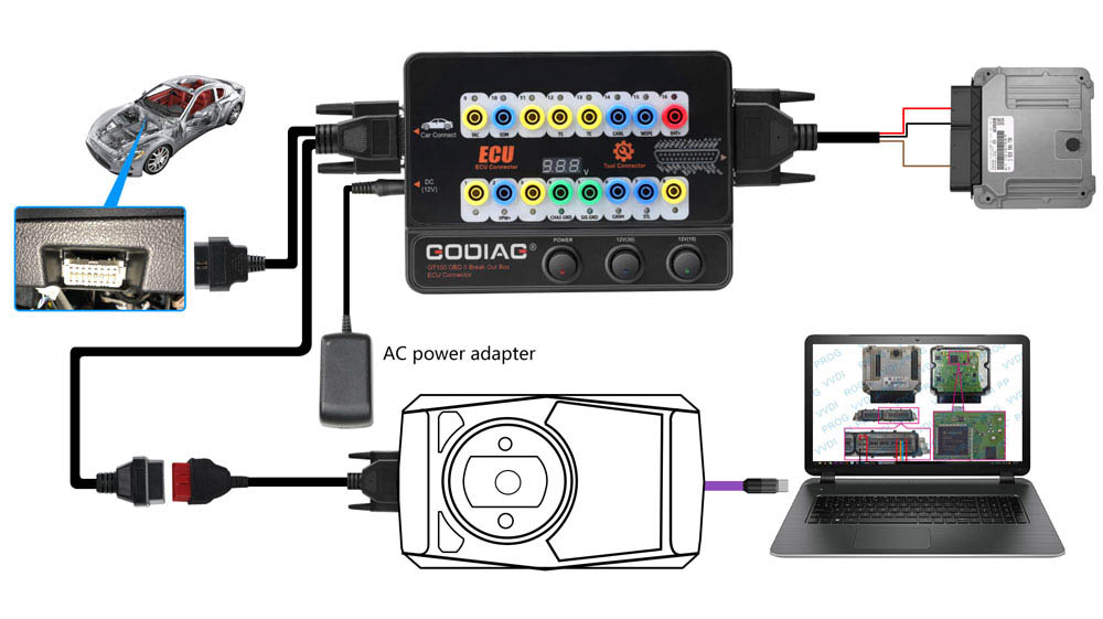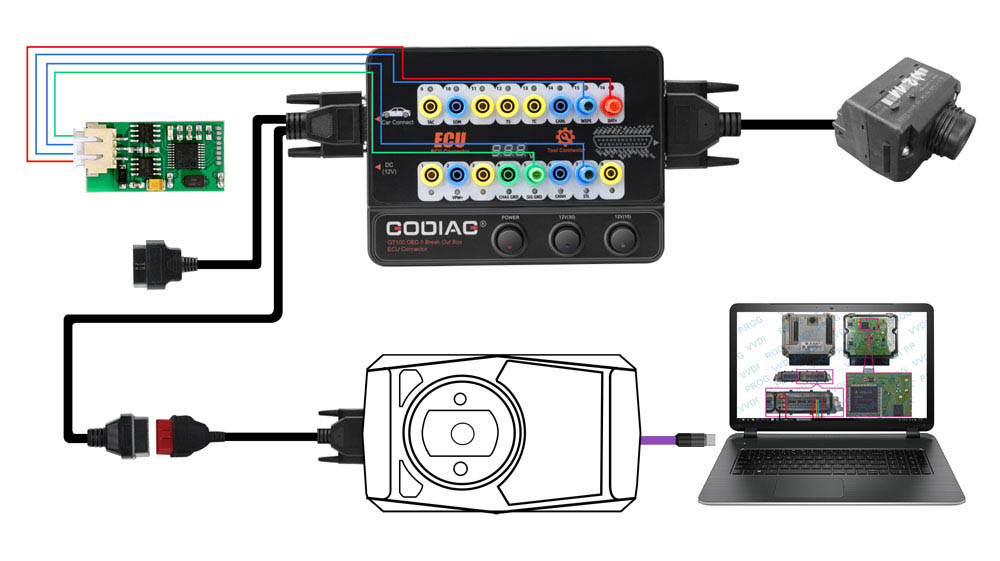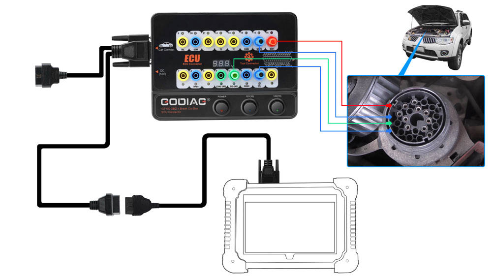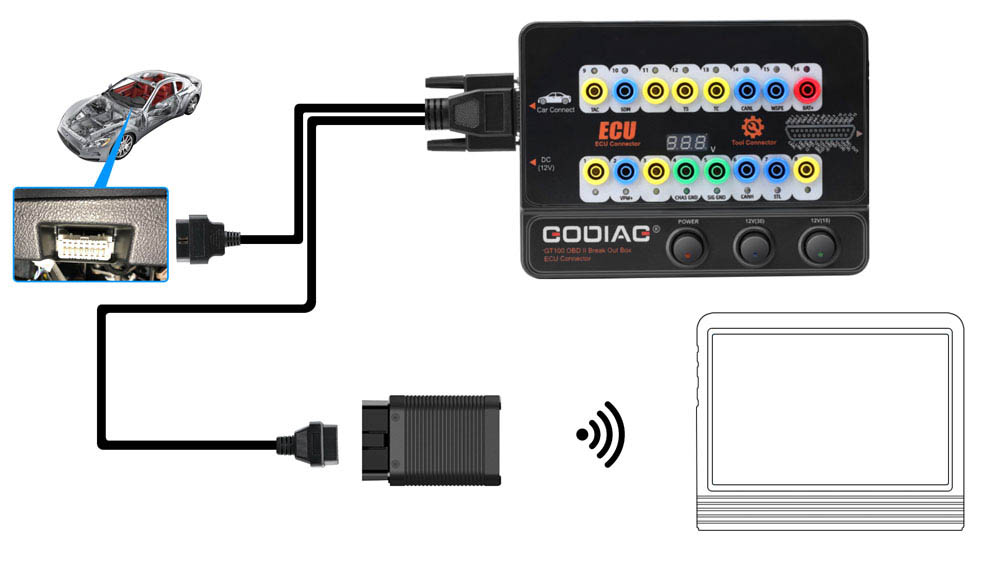 GODIAG GT100, connected to a single ECU module, is convenient for a user to do the single-module diagnosis and programming.