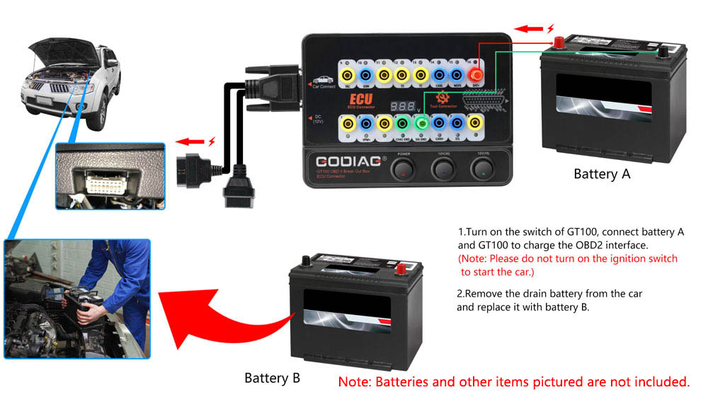 1). Prepare battery A to supply power by connecting to No. 16 / 4 / 5 holes of Godiag GT100 & to the OBD2 diagnostic interface of the car.