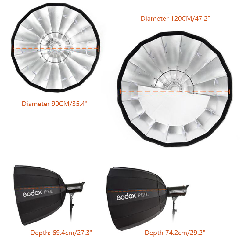 The Deep Parabolic Softbox adopts a parabolic design with a large depth and can send light straight from a long distance, so that the light decreases from the center to the edge, and the light changes more uniformly, providing high saturation and high softness for shooting. It is easy to install, easy to operate. It is portable and can be used widely.