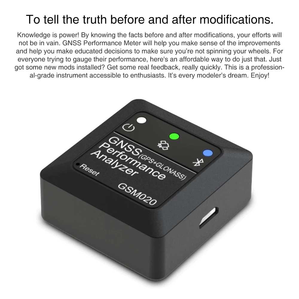 Knowledge is power and by knowing the facts before and after modifications, your efforts will not be in vain. The GNSS Performance Meter will help you make sense of the improvements and help you make educated decisions to make sure you're not spinning your wheels. This is a professional-grade instrument accessible to enthusiasts. It's every modeler's dream. Enjoy it!