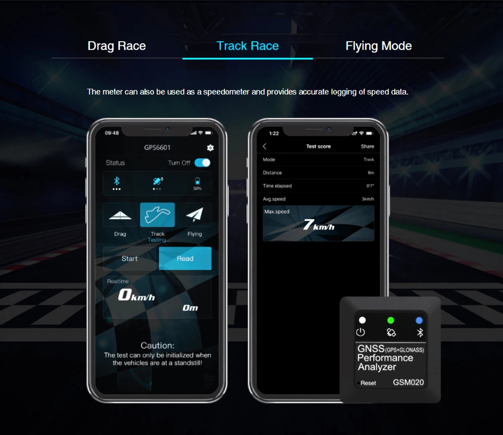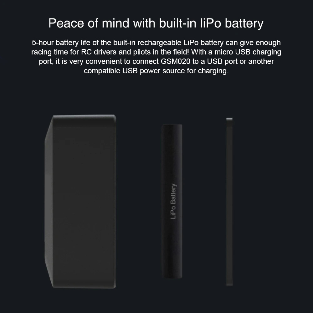 GSM020 GNSS Performance Analyzer allows you to measure and analyze many aspects of your RC car & aeroplane's performance using the latest GNSS engine (GPS, GLONASS) which gives you acceleration, G-force, speed, distance and time. GSM020 uses barometric pressure sensor to detect the height above the ground level. It can measure peak altitude up to 29,500 feet (9000m).