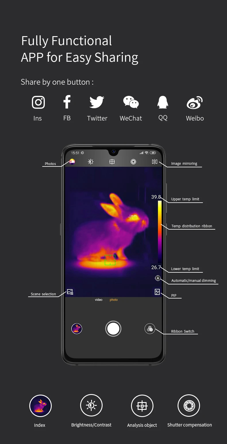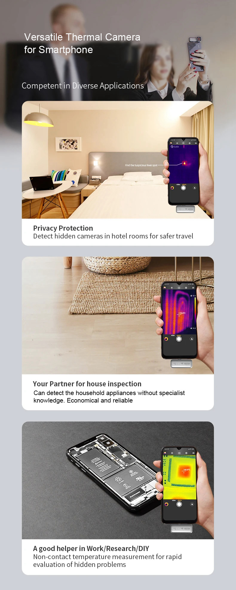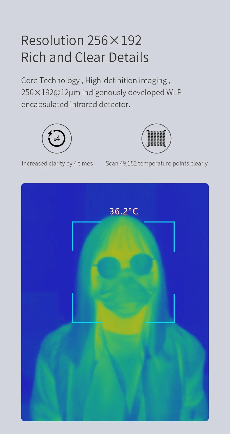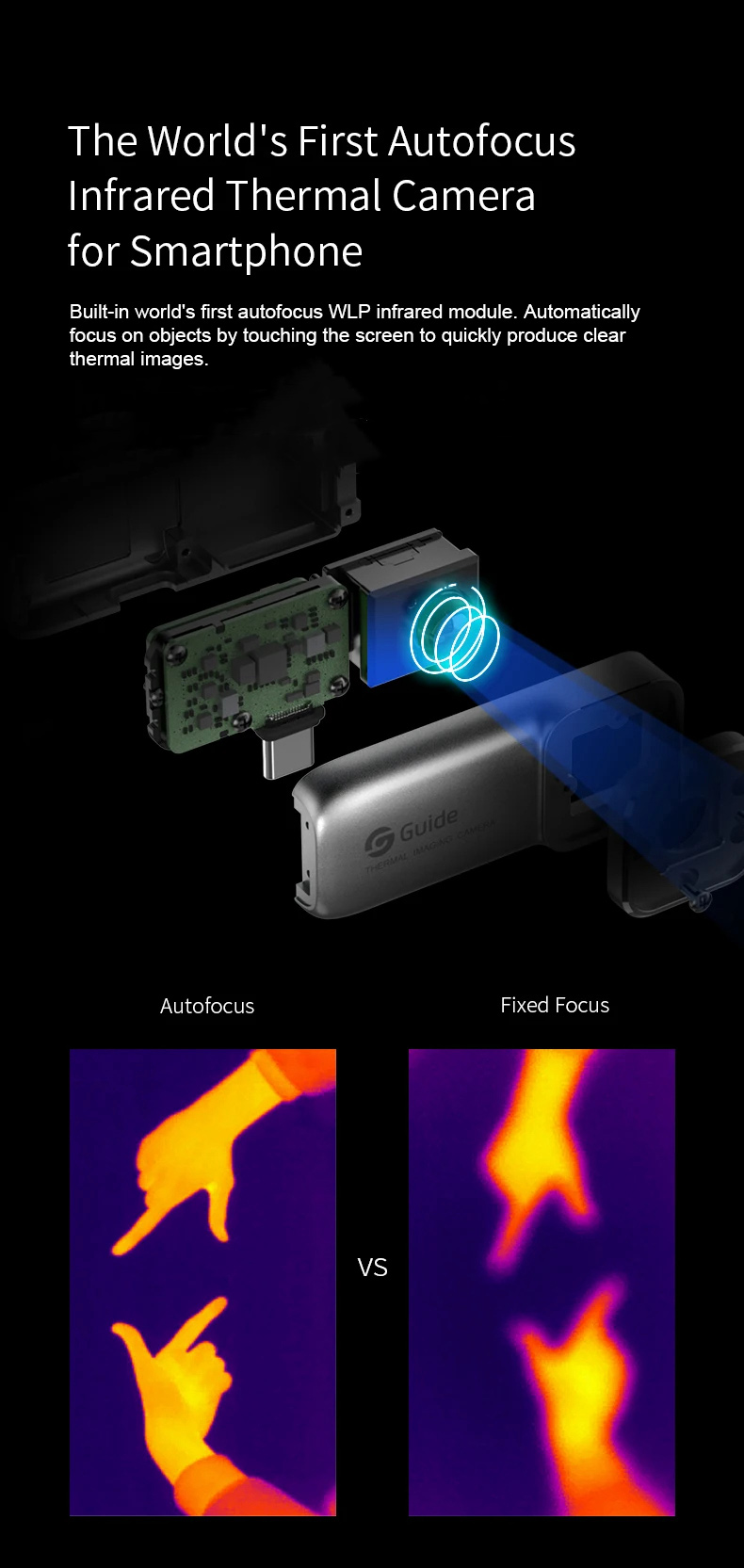 * Built-in world's first autofocus WLP infrared module. Automatically focus on objects by touching the screen to quickly produce clear thermal images