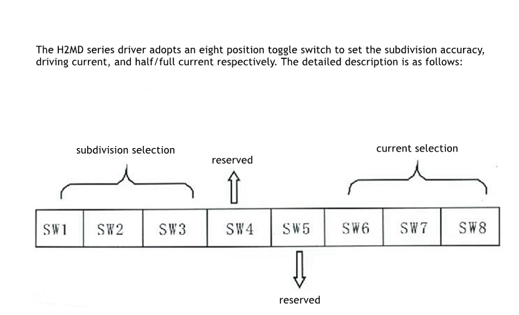 - The H2MD series driver is a high-performance stepper motor driver developed using standard sine current control technology. It can effectively eliminate current ripple and suppress motor vibration, improve motor performance, and extend service life. The driving voltage is DC20V~DC120V, which can be adapted to various domestic and foreign brands. The current is below 6.0A, and the outer diameter is 57mm~86mm for four-wire, six-wire, and eight-wire two-phase hybrid stepper motors.