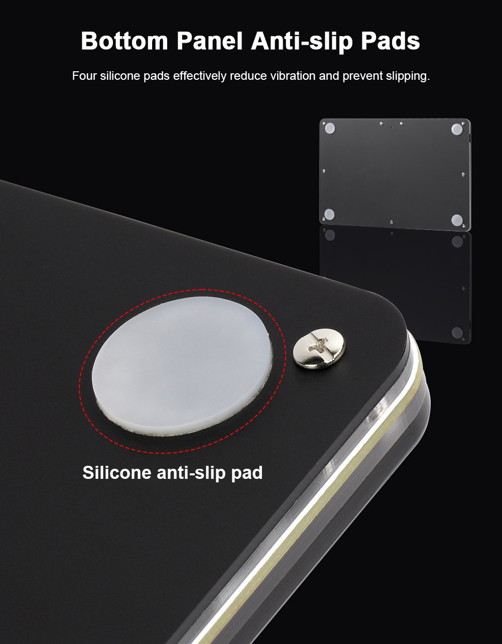 * Bottom panel anti-slip pads: Four silicone pads effectively reduce vibration and prevent slipping