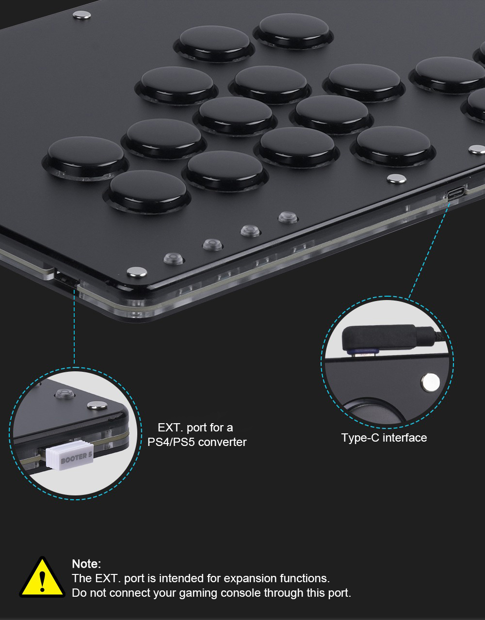 * Connectivity Features: Equipped with an EXT. port for a PS4/PS5 converter and a Type-C interface. Note: The EXT. port is intended for expansion functions. Do not connect your gaming console through this port.