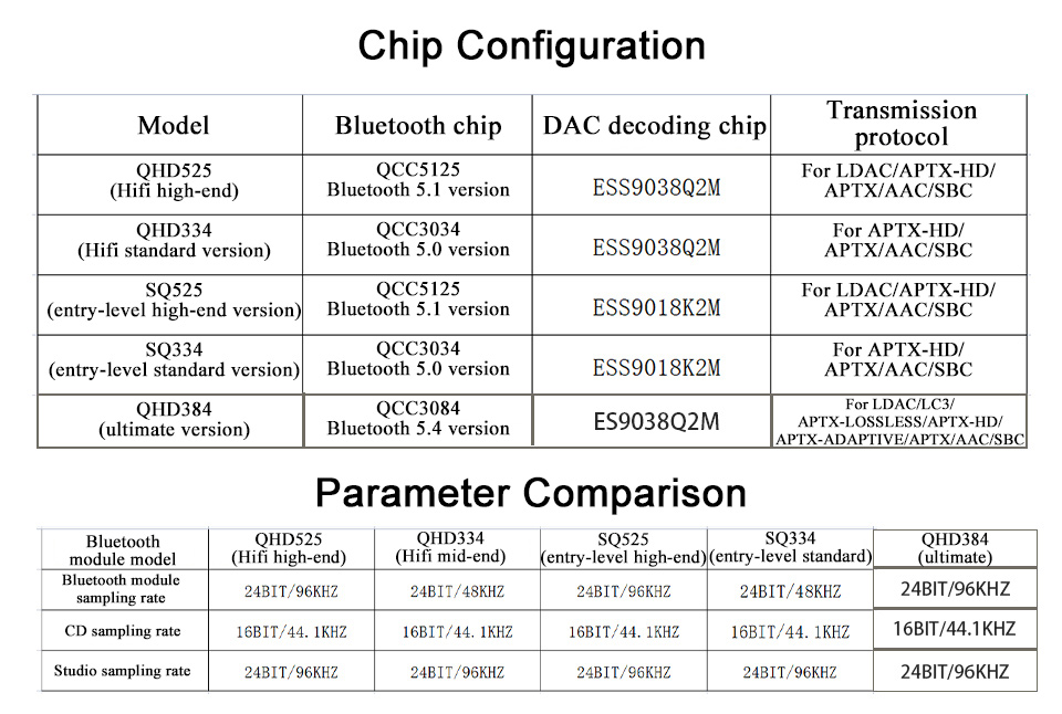 The higher the above parameter value, the better the sound quality. The difference between the QHD series and the SQ series is the DAC decoding chip model. The QHD series uses the flagship ESS9038Q2M/ES9038Q2M chip, and the SQ series uses the sub-flagship ESS9018K2M chip. The Bluetooth model is the corresponding model. Other motherboard components of these two series are exactly the same.