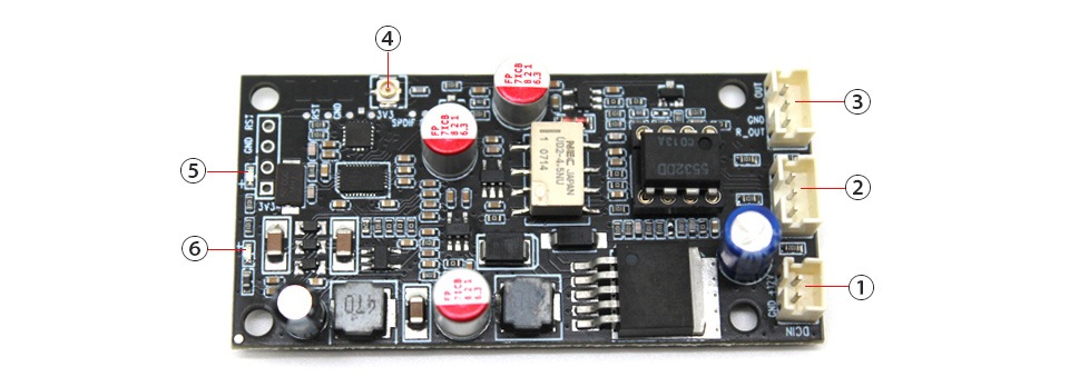 ② AUX analog audio input: red wire connects to the right channel, black wire is the common ground wire, and white wire connects to the left channel.