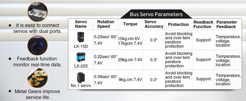 - Intelligent serial bus servo with high precision, data feedback and friendly wiring