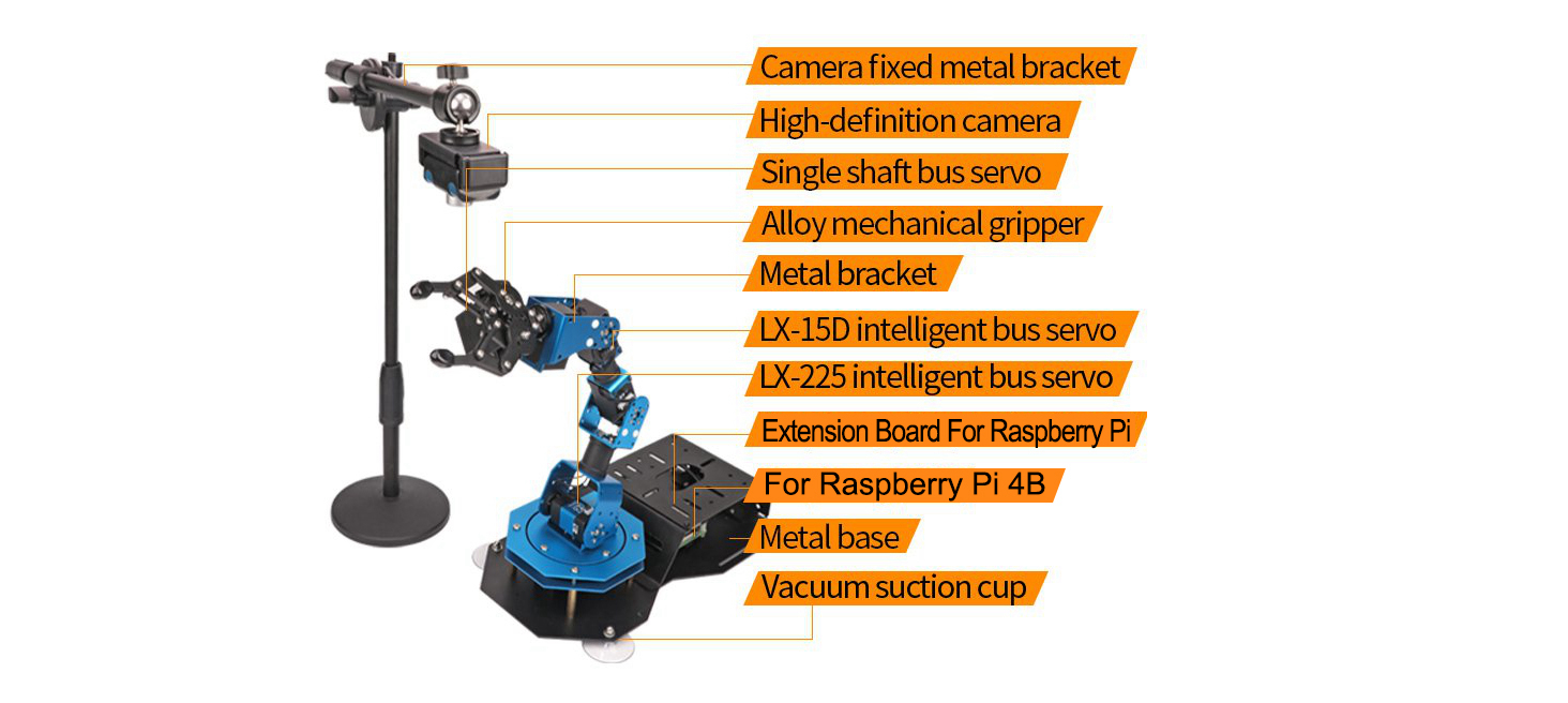 ArmPi uses intelligent serial bus servo with high precision, feedback function and convenient wiring which reduces the friction between wire and brackets. The servo at the base is upgraded to a 25KG torque servo so that ArmPi can grab more than 250g and the movement is more steady