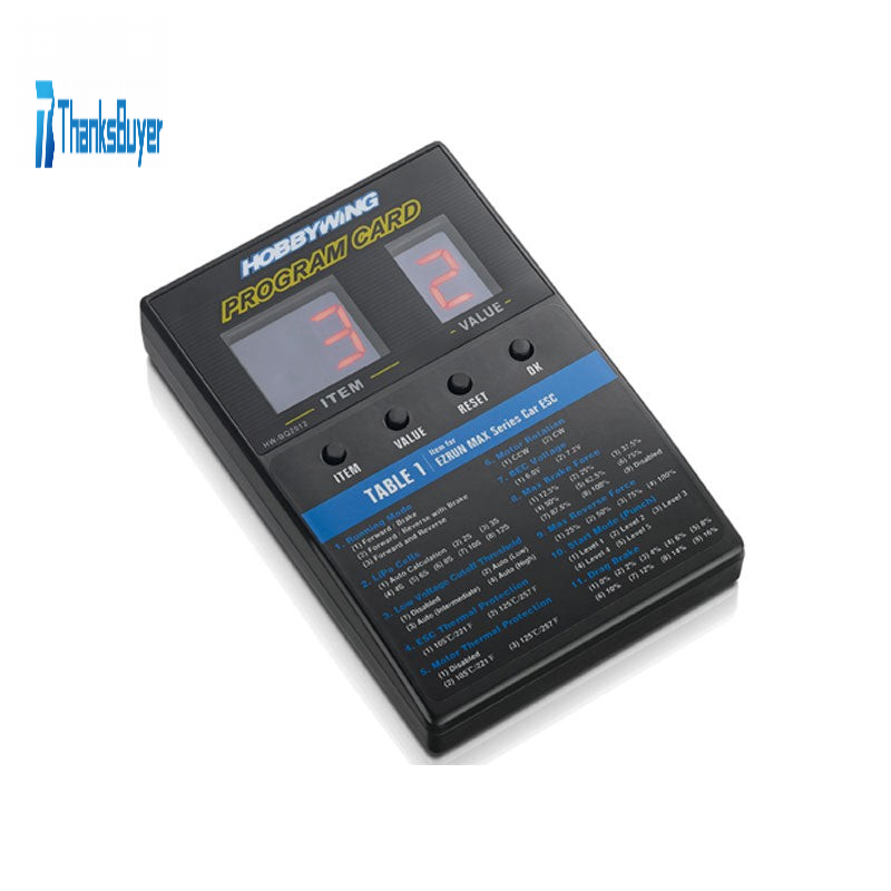 This LED program box is for programming HobbyWing brushless ESCs. Its friendly interface makes ESC programming easy and quick. It's compact, portable and very applicable for field use.