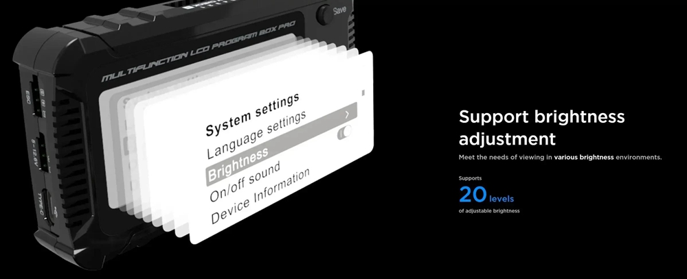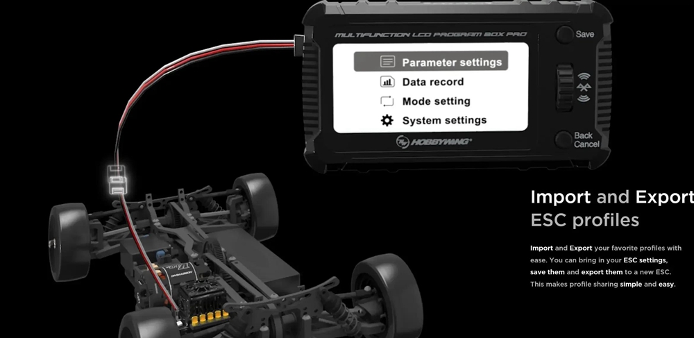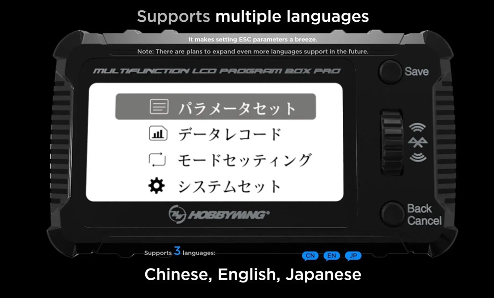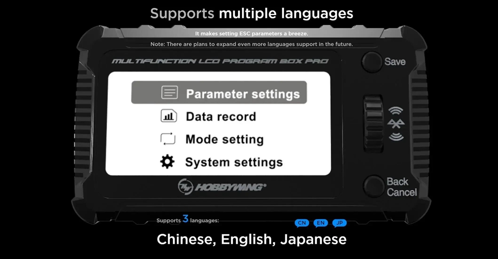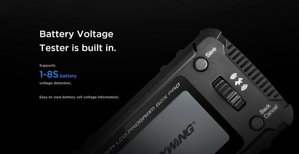 - Input voltage: 5 - 12.6V (Only when there is no voltage output from the ESC programming interface, a separate battery pack is needed to power the setting box.)