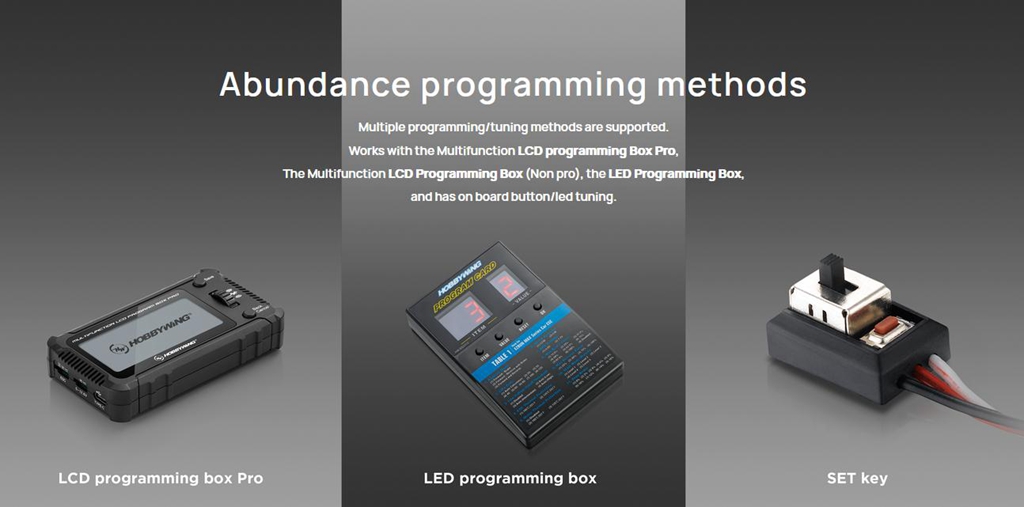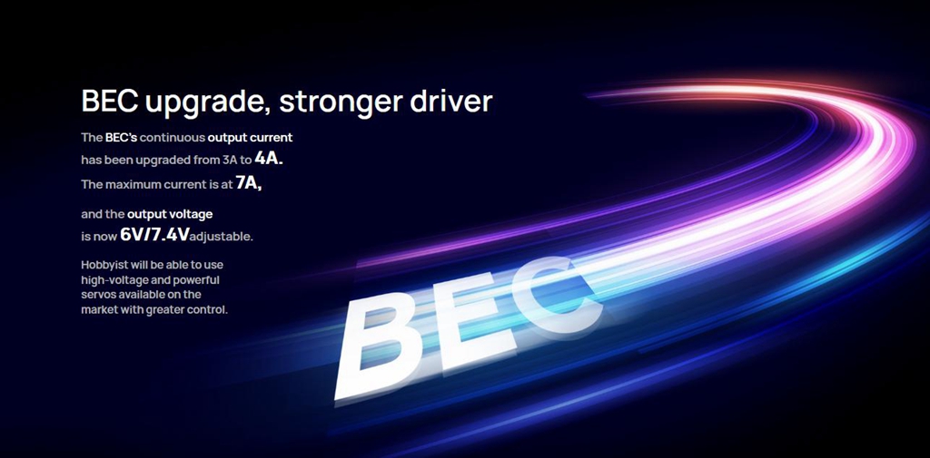 - BEC output: switch mode 6V/7.4V at 4A (switch stabilized voltage mode)