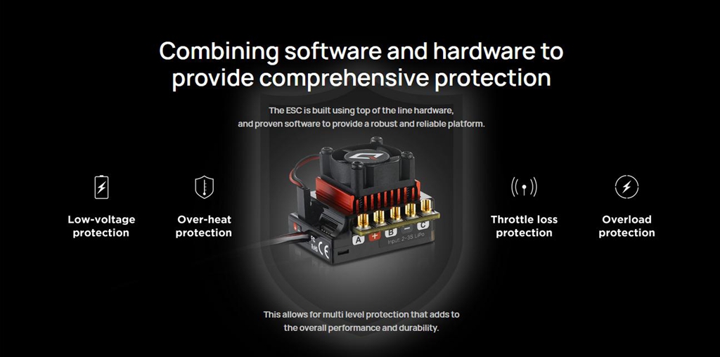 - Before using this ESC, please carefully review the manuals of all power equipment and chassis to ensure a reasonable power combination and avoid overloading the motor due to incorrect power combination, which may ultimately damage the ESC.