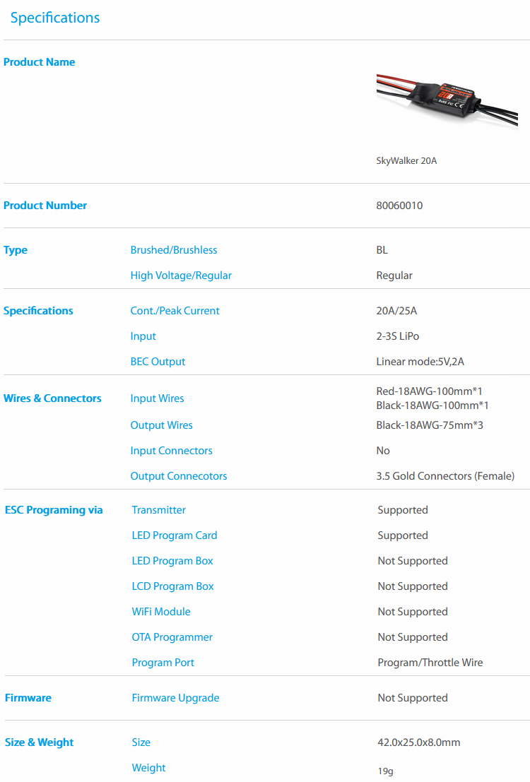 Hobbywing SkyWalker 20A Brushless ESC 2-3S LIPO Drone ESC Electronic Speed Control (without Plug)