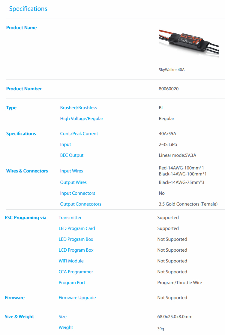 Hobbywing SkyWalker 40A Brushless ESC Electronic Speed Control Drone ESC (with XT60 Plug)
