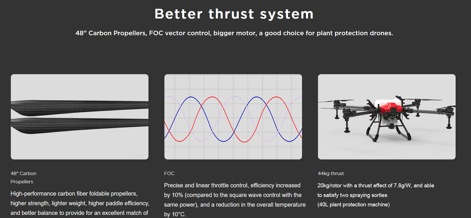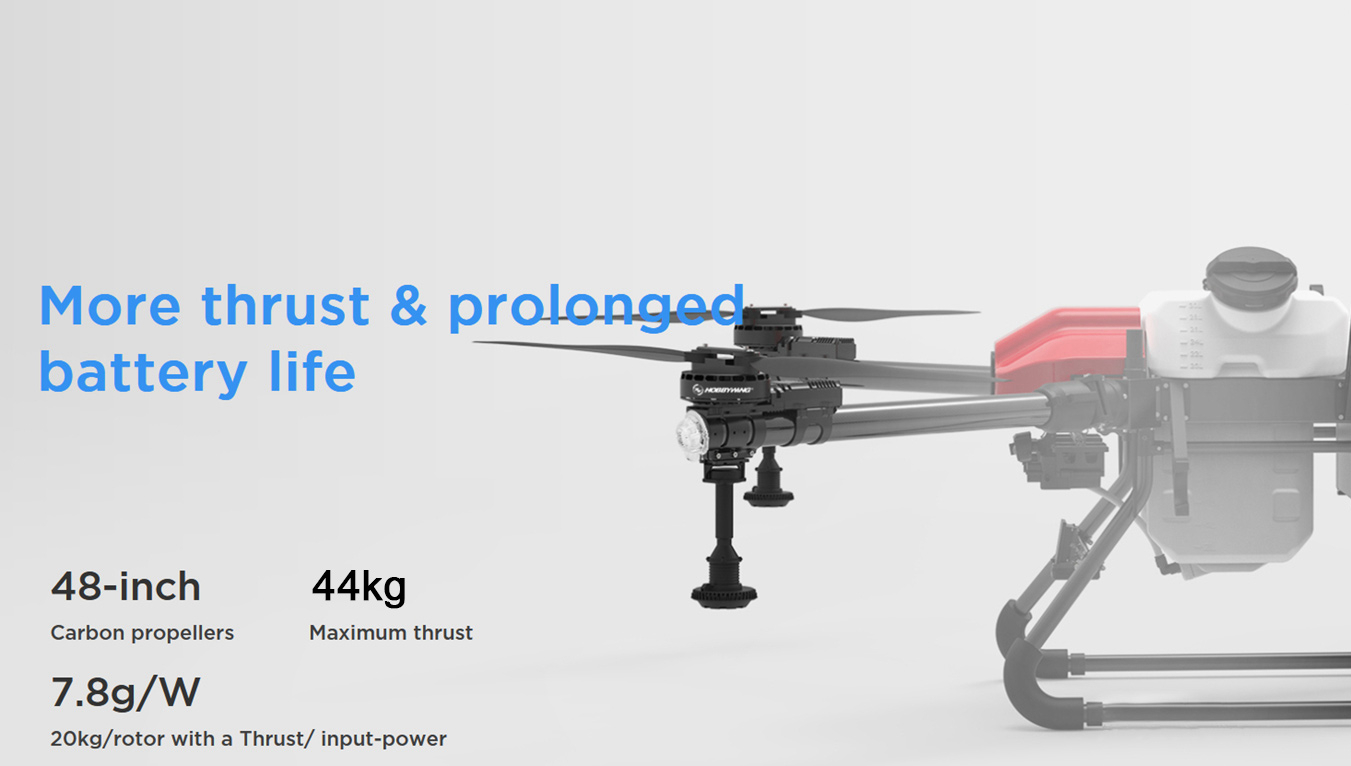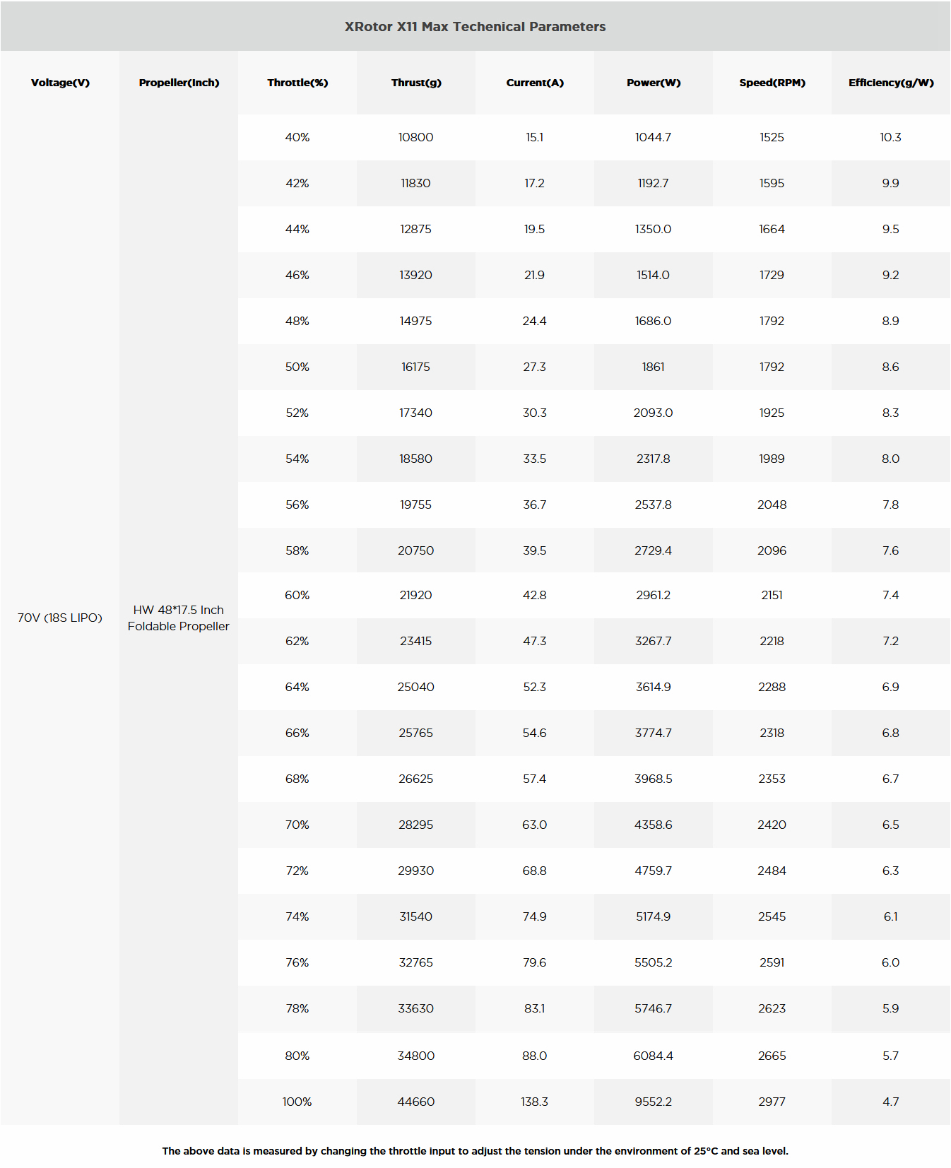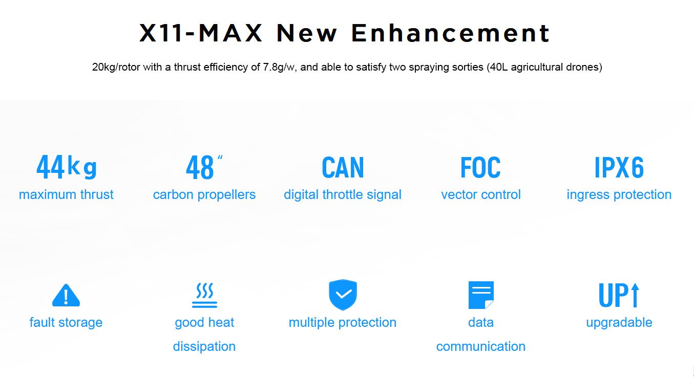 - Max Thrust: 44kg/rotor (70V, Sea Level)