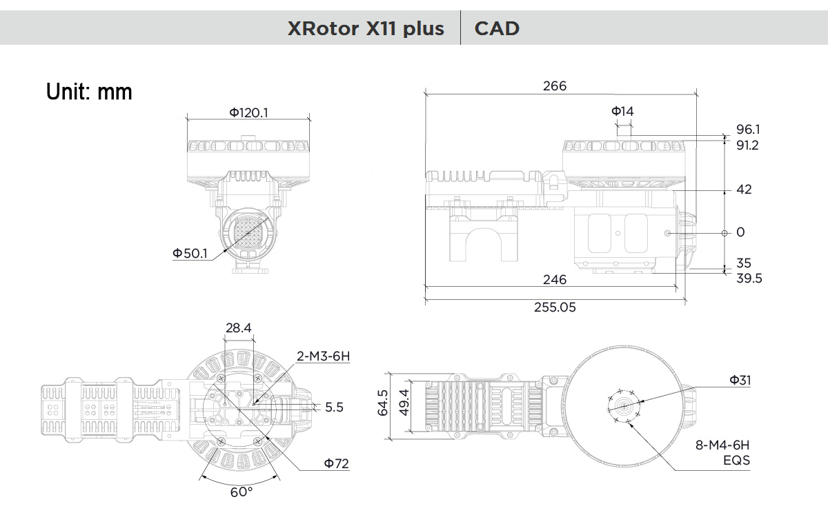 * The X11 Plus power system is equipped with several protection functions such as: Power-on self-test, Power-on voltage abnormal protection, Current protection and Stall protection. It is able to output an operating status data to the flight controller in real time