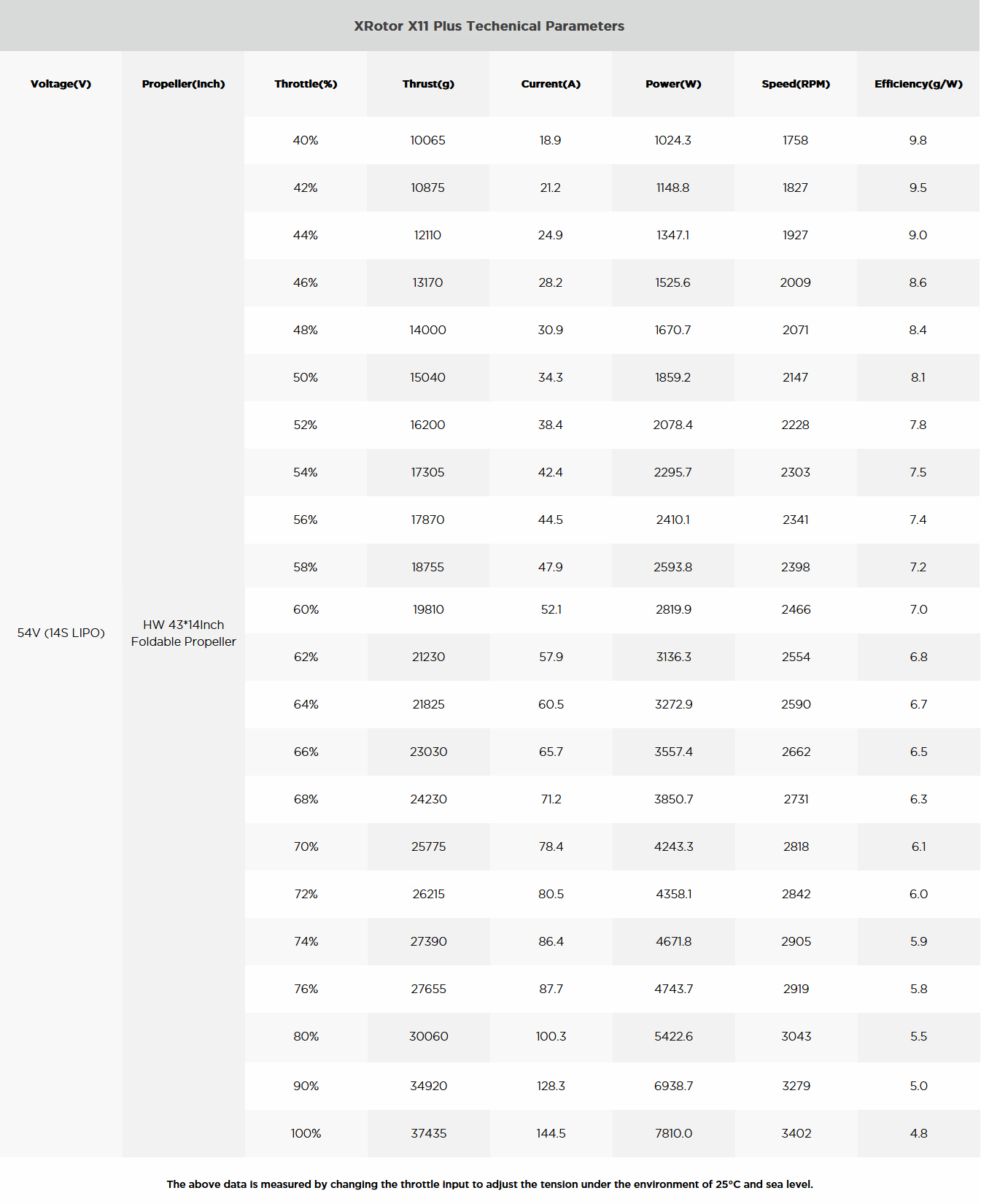 * Recommended Takeoff Weight: 15-18kg/rotor (54V, Sea Level)