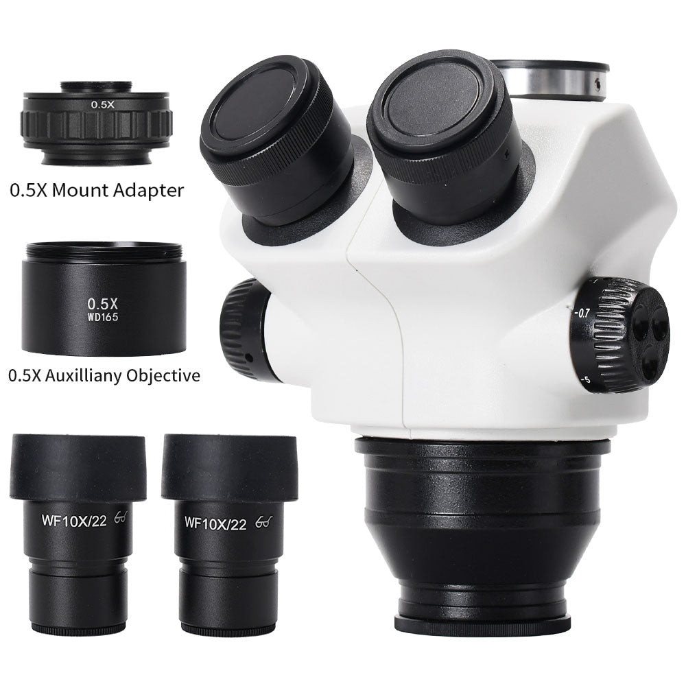 - Working distance: 7X-50X (100mm); Use 0.5x objective lens 3.5X-22.5X (165mm)