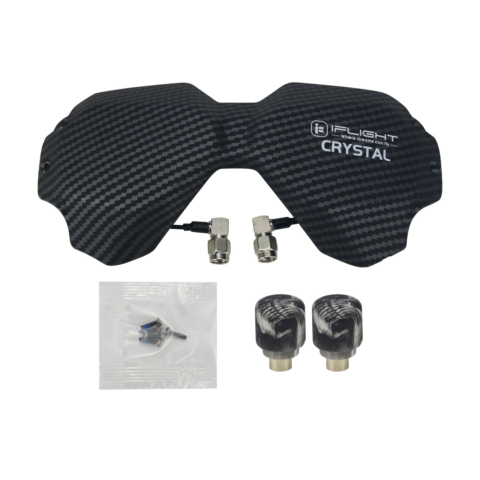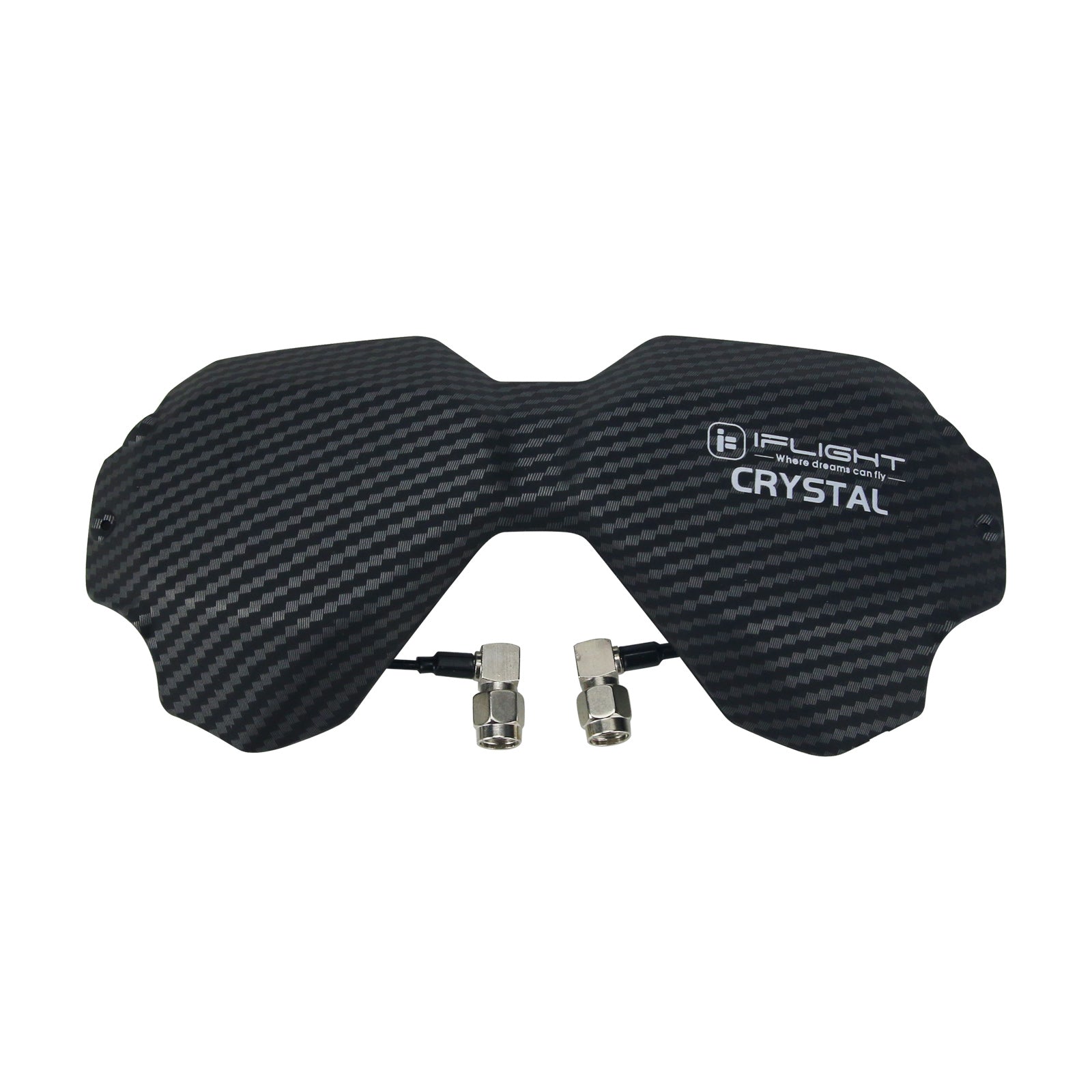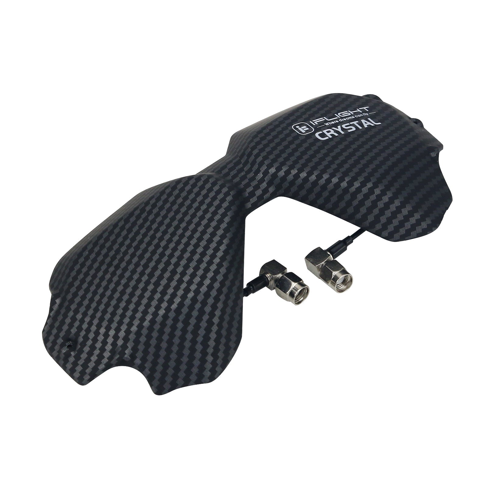 Let's welcome our new iFlight Crystal HD 5.8GHz Directional Antenna! Specially designed for the DJI Digital FPV Goggles to replace the stock front plate with our iFlight engineered Antenna Array. NO, this is not another patch antenna! Two carefully designed and highly sensitive LHCP high gain directional antennas give you a better reception at long range as well as better penetration through trees, bandos or other difficult terrains. Low profile design to decrease your pack size to a minimum, and high quality RG178 cables for best durability. We were able to achieve a super wide antenna beam width through an offset angle of 30 degrees between the two antennas. Horizontal beam of 105 degrees and vertical beam of 75 degrees at 9dBi gain, dropping of slowly the further you get to the side! Low loss with a 93% antenna efficiency and a axial ratio of ≤1.6 through the whole band. If that's not enough, we also gave you the option to either mount your antennas at the bottom or top pair of the Goggle RP-SMA connectors. Multiple designs available, get them as long they last!