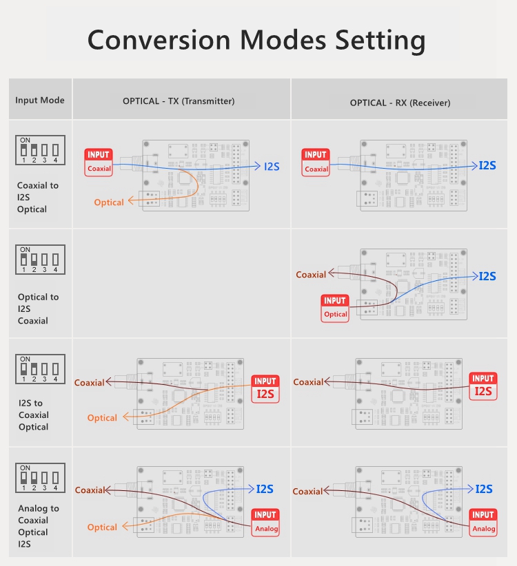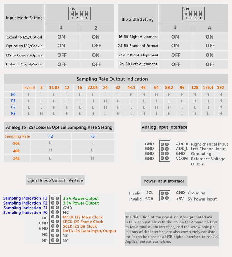 - It uses a high-quality 4-bit toggle switch to set the conversion mode and output data bit depth, 1/2 bit to set the conversion mode, and 3/4 bit to set the data output bit depth in the current working mode.