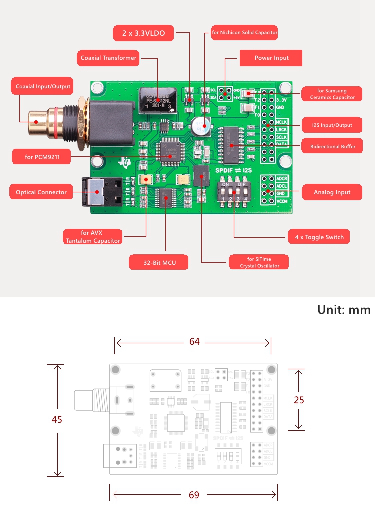 - For PCM9211 chip is comparable to original professional level digital audio transceiver chip for TI; Supports up to 216K sampling rate, with ultra-low jitter function and performance of coaxial transceiver clock <50RMS.