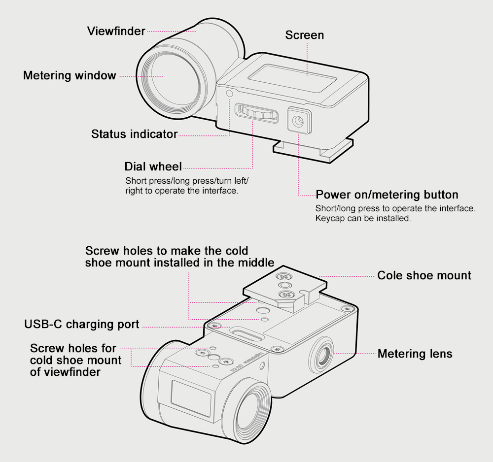 The LightMate Area 2S is a 17° light meter with a detachable optical metering viewfinder. The 17° metering angle provides a near spot meter experience. With the metering viewfinder, the LightMate Area 2S is able to quickly and precisely aim at the subject for more accurate metering.