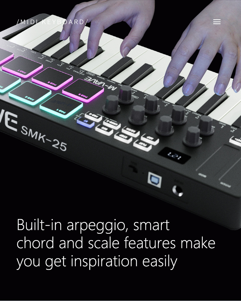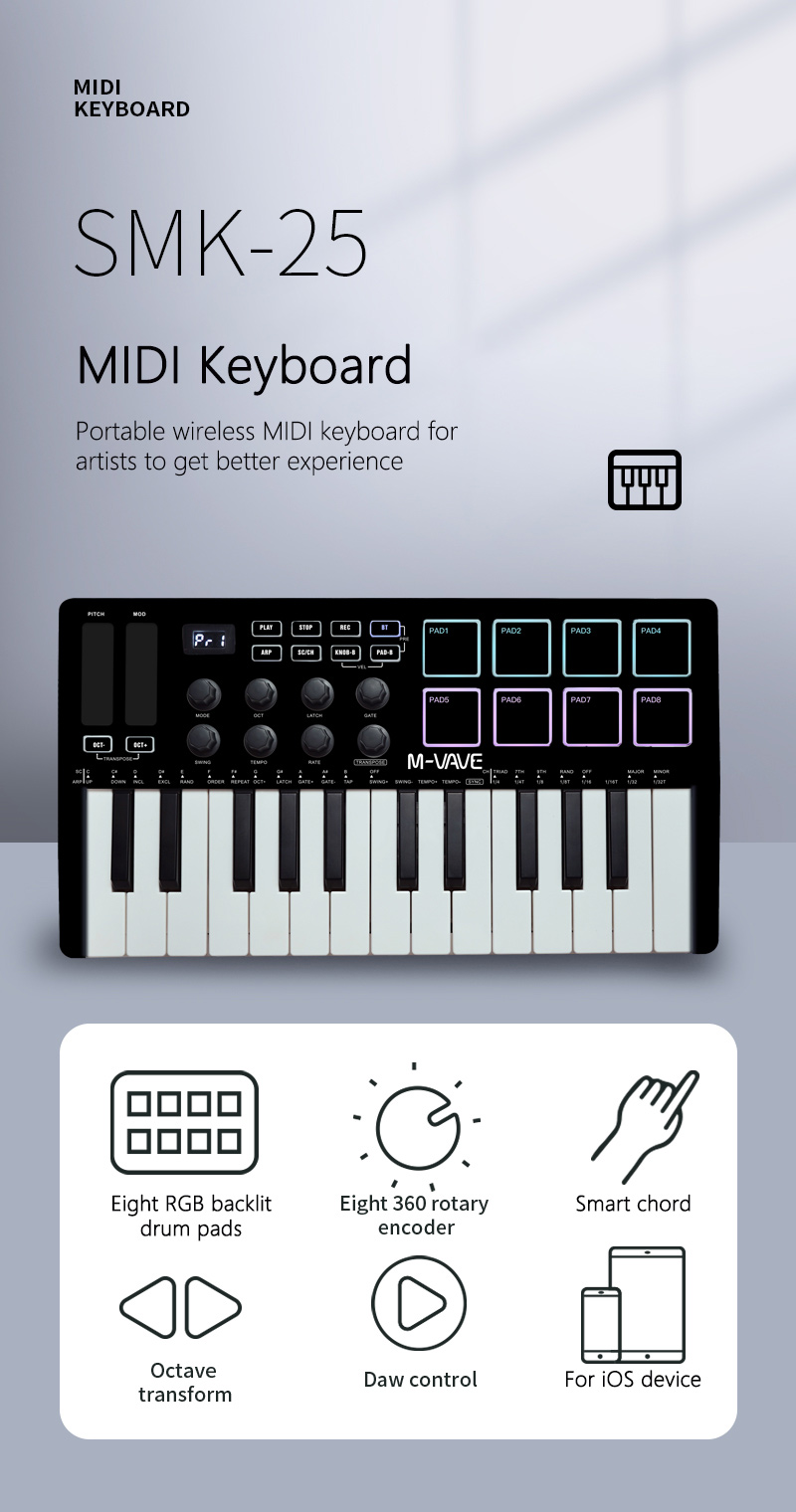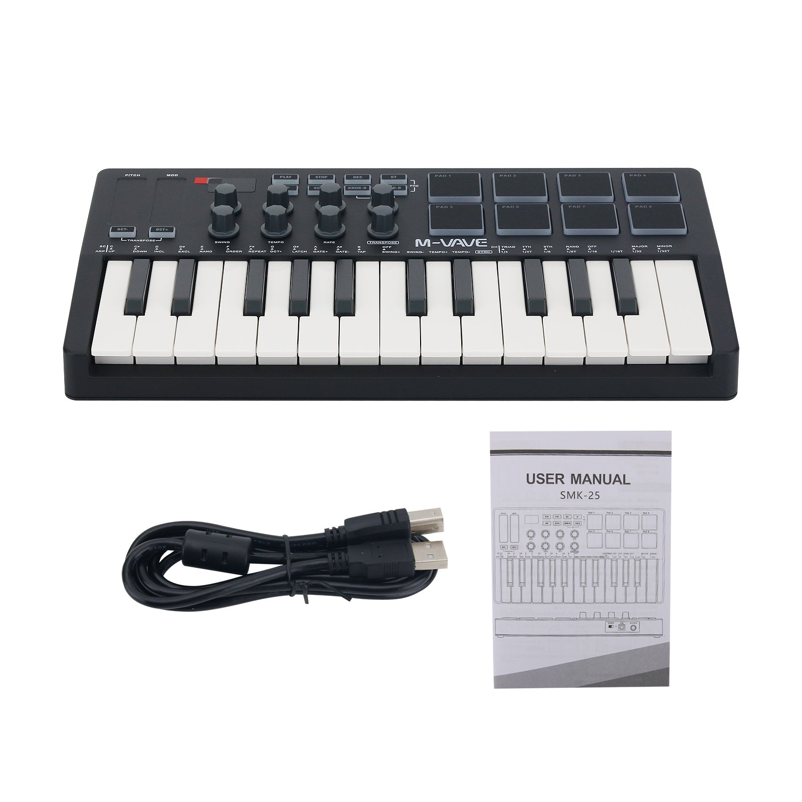 M-VAVE SMK-25 Black 25 Key MIDI Keyboard Controller with RGB Backlit Drum Pads for Arrangement