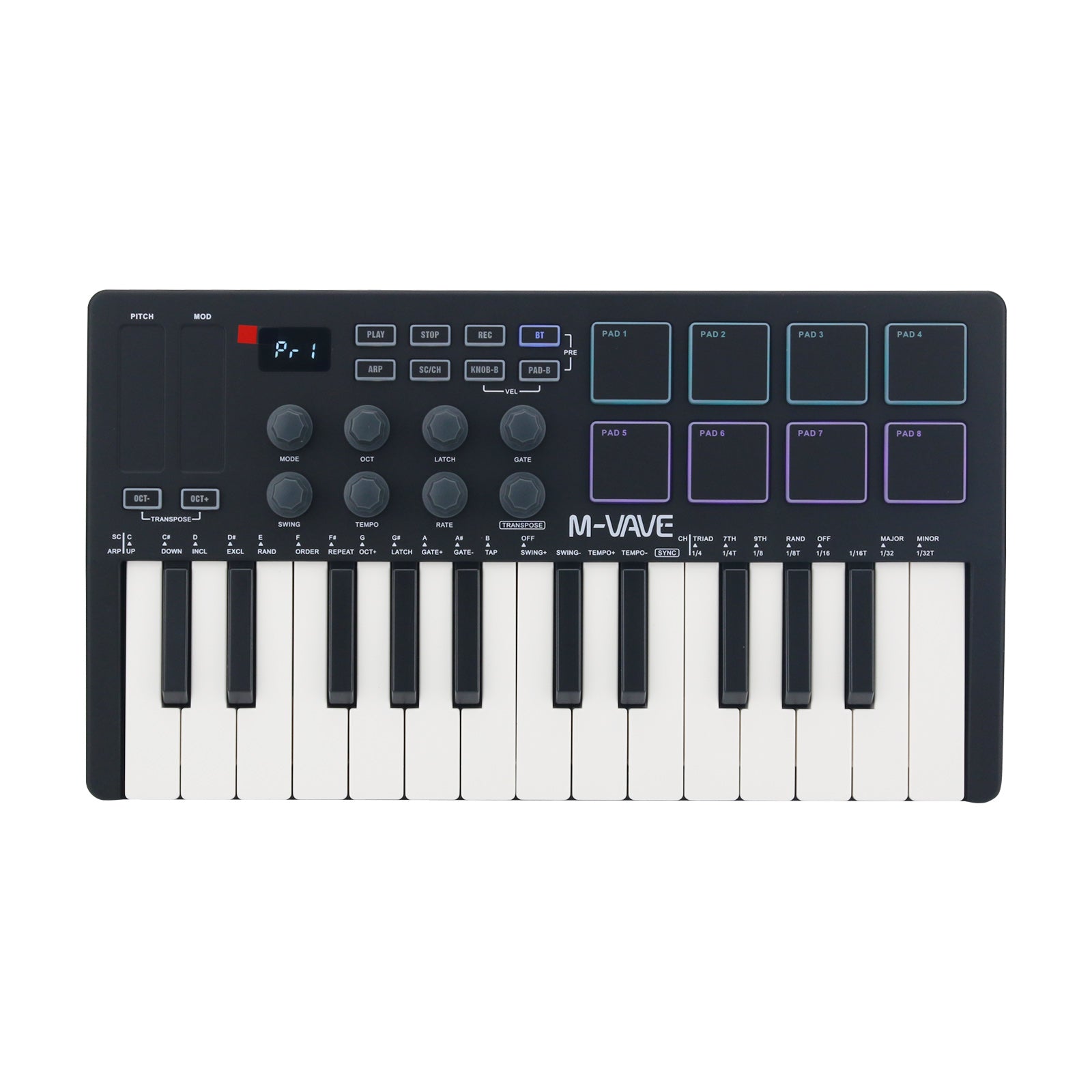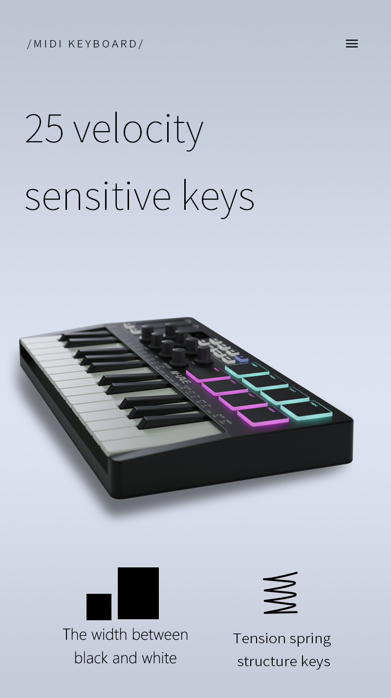 - MIDI keyboard with 25 keys and 8 drum pads