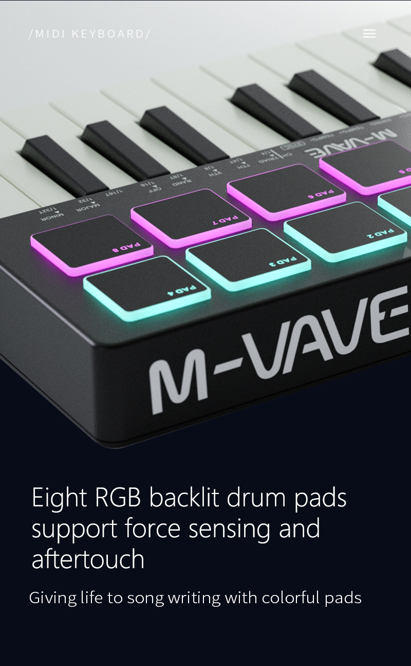 - Drum pads: 8 RGB backlit drum pads support force sensing and aftertouch