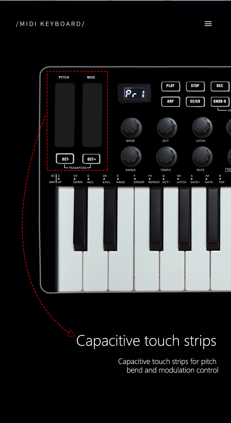 - 2 capacitive touch strips for pitch bend and modulation control