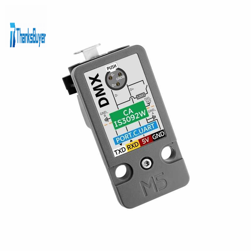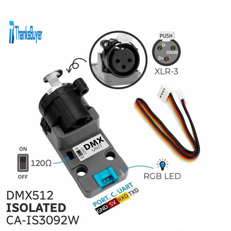 - DMX Unit is a communication unit designed specifically for DMX-512 data transmission scenarios, integrating CA-IS3092W isolated half duplex RS-485 transceiver, providing up to 5kVrms of electrical isolation guarantee. The onboard 120Q terminal resistor is connected to the switch to match the characteristic impedance of the signal transmission line, prevent signal reflection and distortion, and can be connected to the line according to the usage scenario. Communicate with the M5 host through the Grove interface via serial port. The device is equipped with XLR-3 female interface, making it convenient for users to connect to DMX devices. This product is suitable for stage lighting control, landscape lighting control, dimmer control and other scenarios.