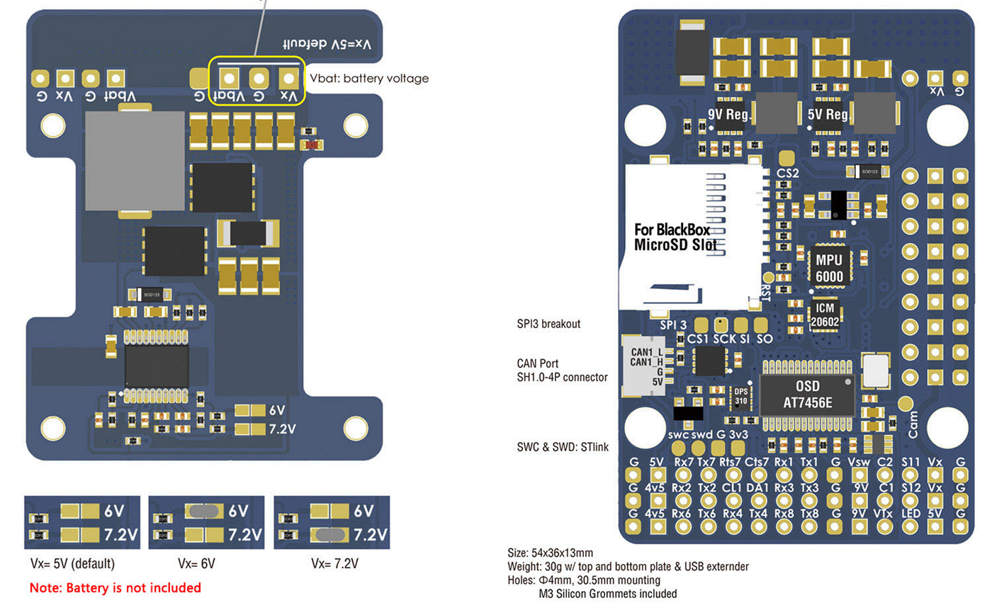 - Current Senor: 132A, 3.3V ADC (Scale 250 in INAV, 40 A/V for ArduPilot)