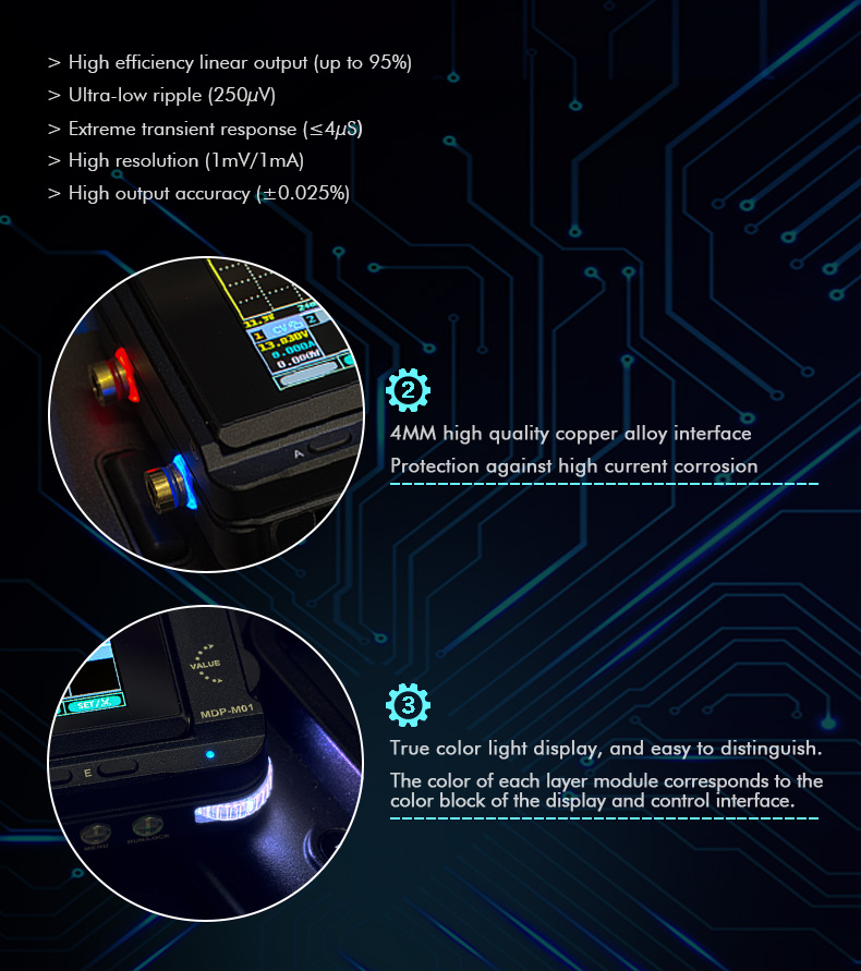 MDP-P906 has the index, stability and reliability comparable to a professional power supply. It can output pure current, and provide powerful functions such as programmable output, timing output, timing control, automatic compensation, boost mode, etc., making itself a real cost-effective, smart and customized programmable linear DC power supply.