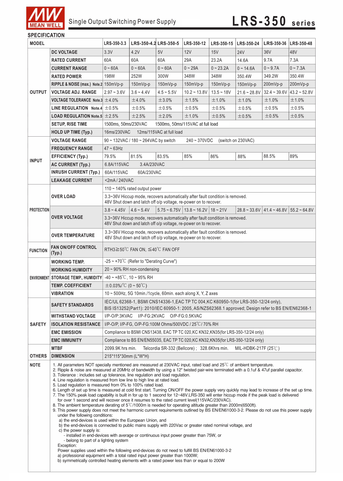 LRS-350 series is a single-output enclosed type power supply with 30mm of low profile design. Adopting the input of 115VAC or 230VAC (select by switch), the entire series provides an output voltage line of 3.3V, 4.2V, 5V, 12V, 15V, 24V, 36V and 48V.