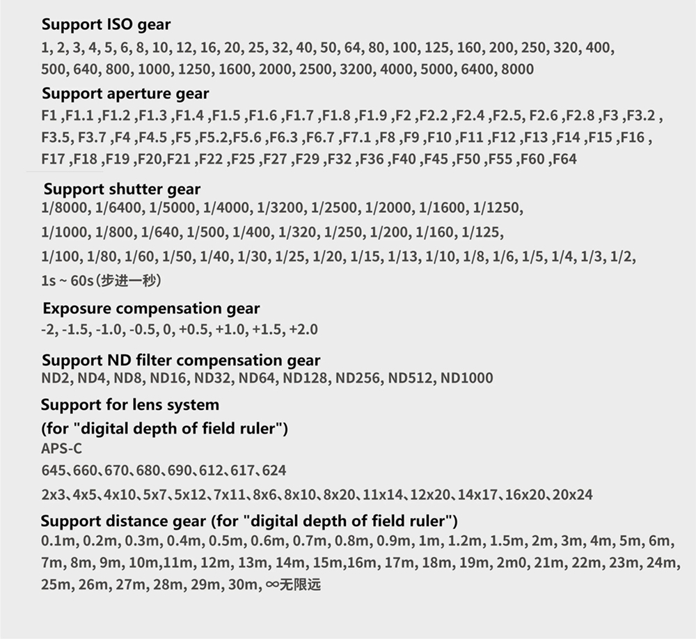 - Exposure combination reciprocity. (Quickly obtain multiple exposure combinations with the same exposure amount)
